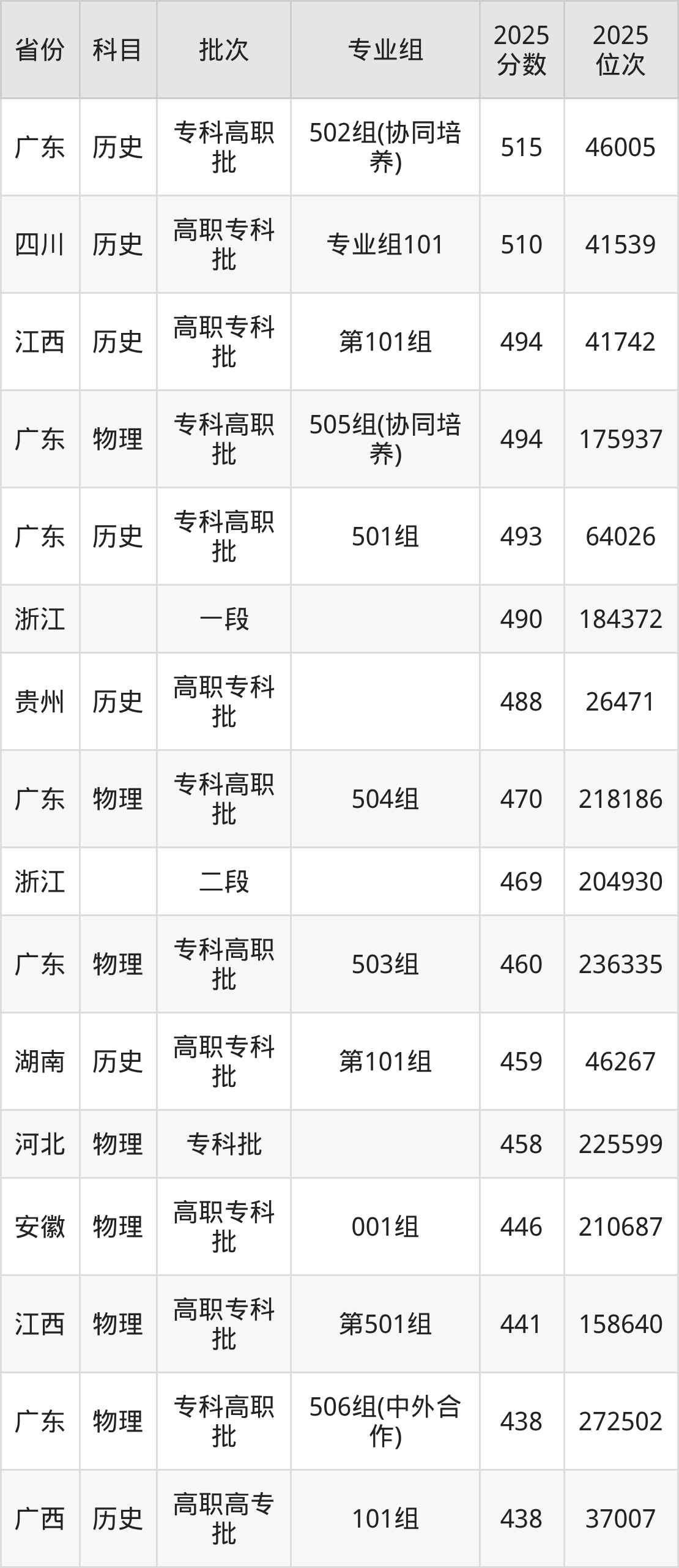 下面是2025年广州铁路职业技术学院在全国各省录取最低分数据及位次,各位考生也可作为一个参考。