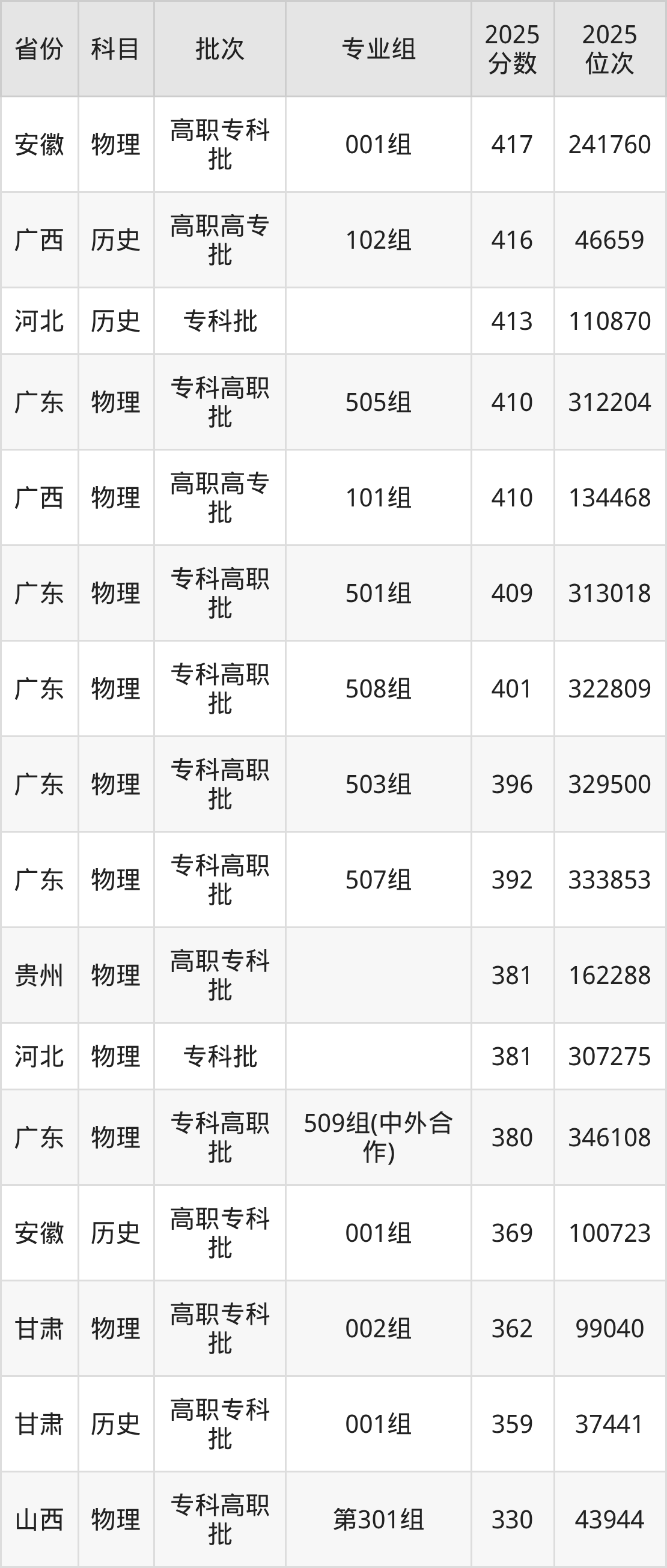 下面是2025年广东理工职业学院在全国各省录取最低分数据及位次,各位考生也可作为一个参考。