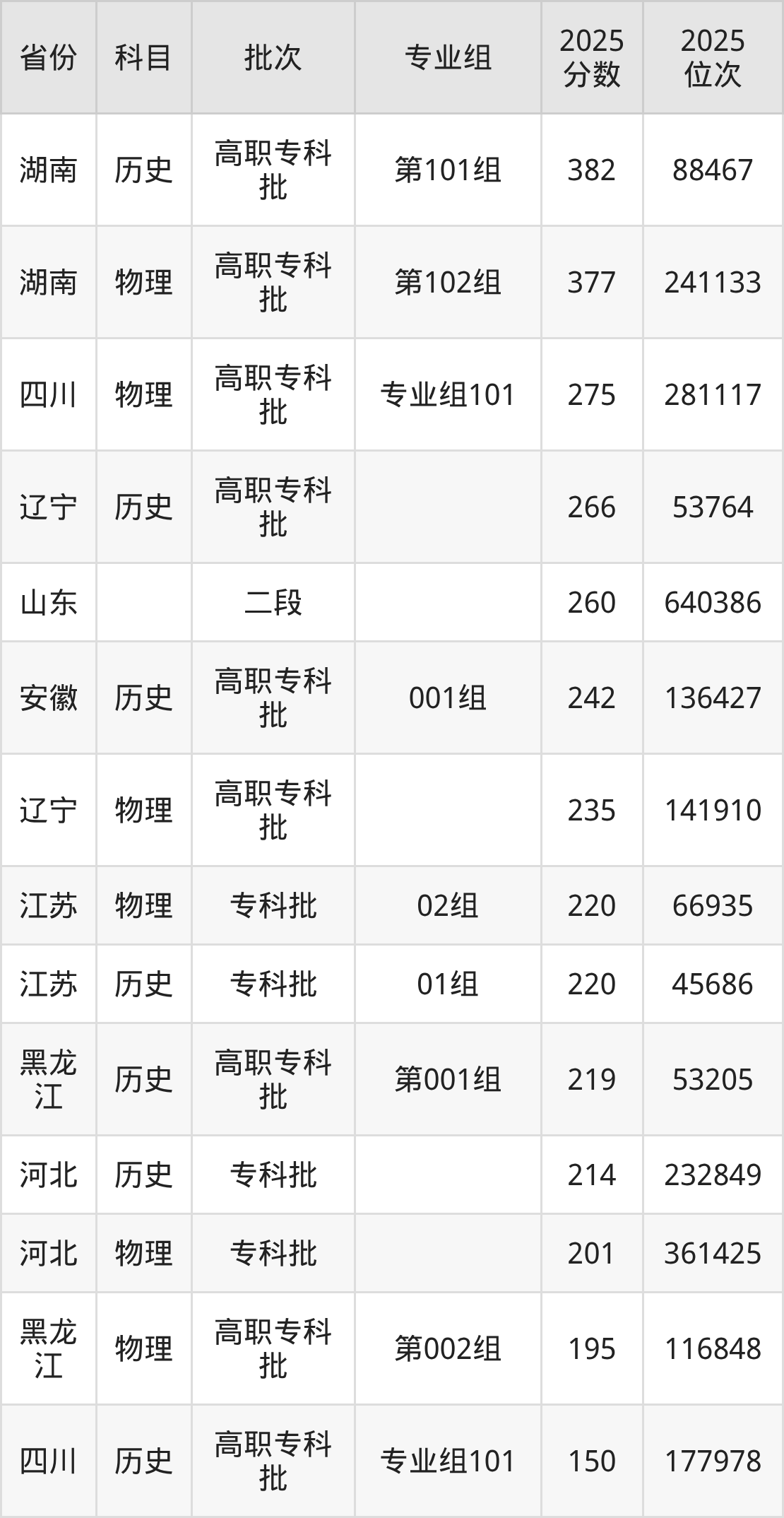 2025年唐山海运职业学院全国录取分数线150分到382分,录取最高在湖南(第101组)、录取最低在四川(专业组101)。