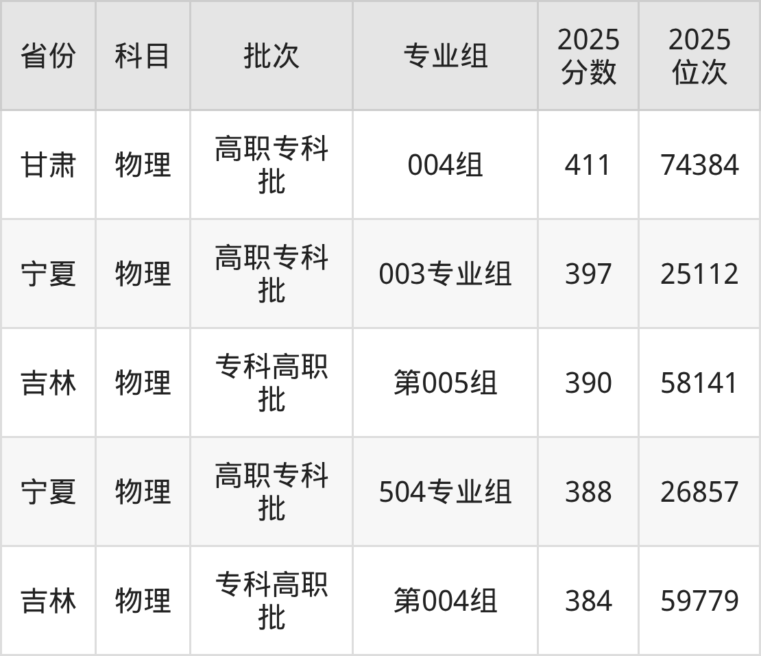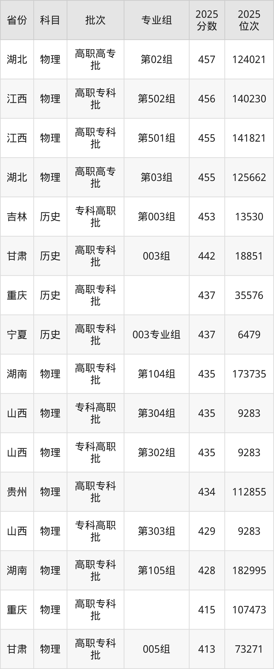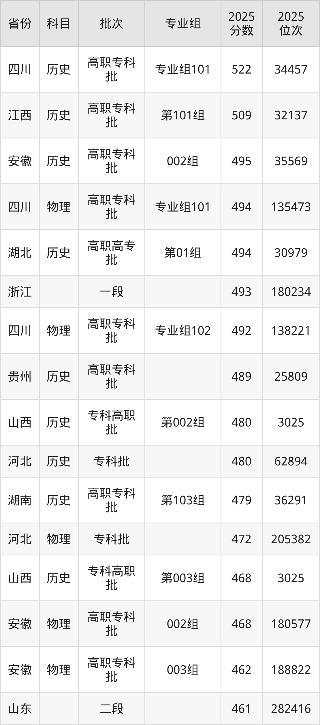 2025年重庆医药高等专科学校全国录取分数线384分到522分,录取最高在四川(专业组101)、录取最低在吉林(第004组)。