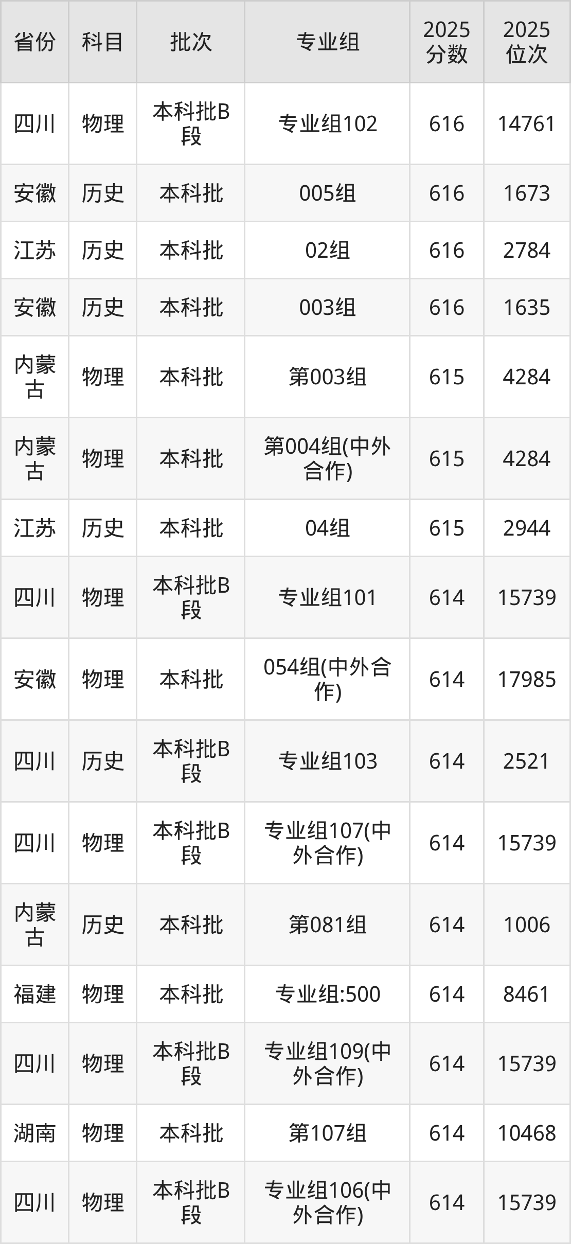 16、金融学:615分、位次15631名;