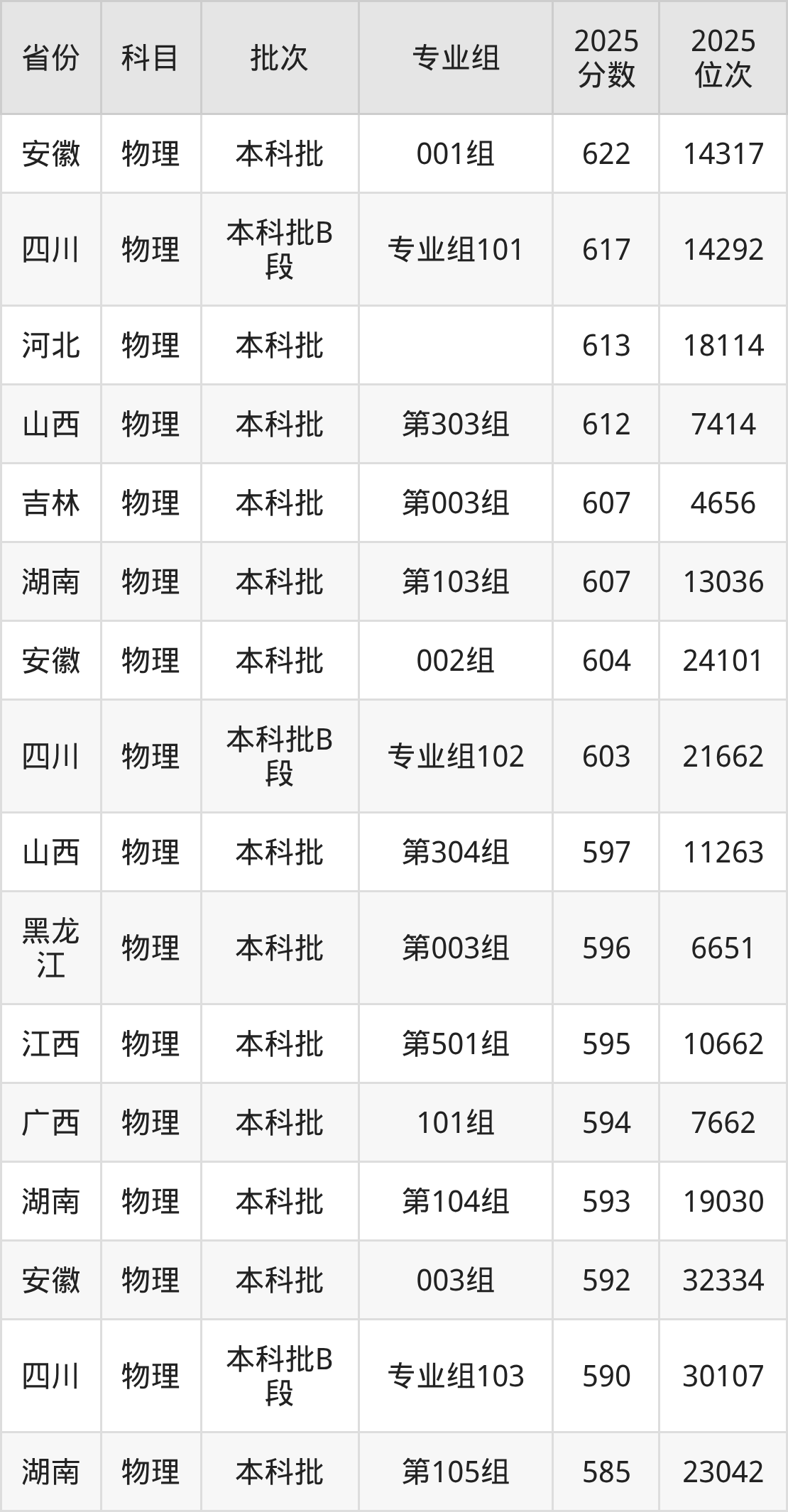 2025年空军军医大学全国录取分数线513分到622分,录取最高在安徽(001组)、录取最低在广西(103组)。