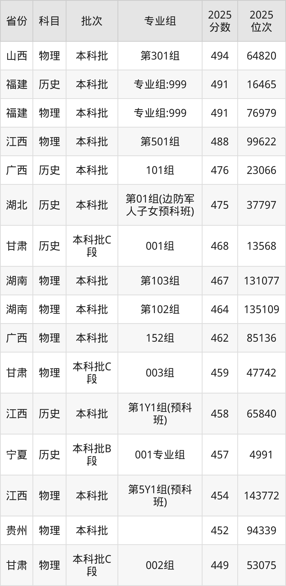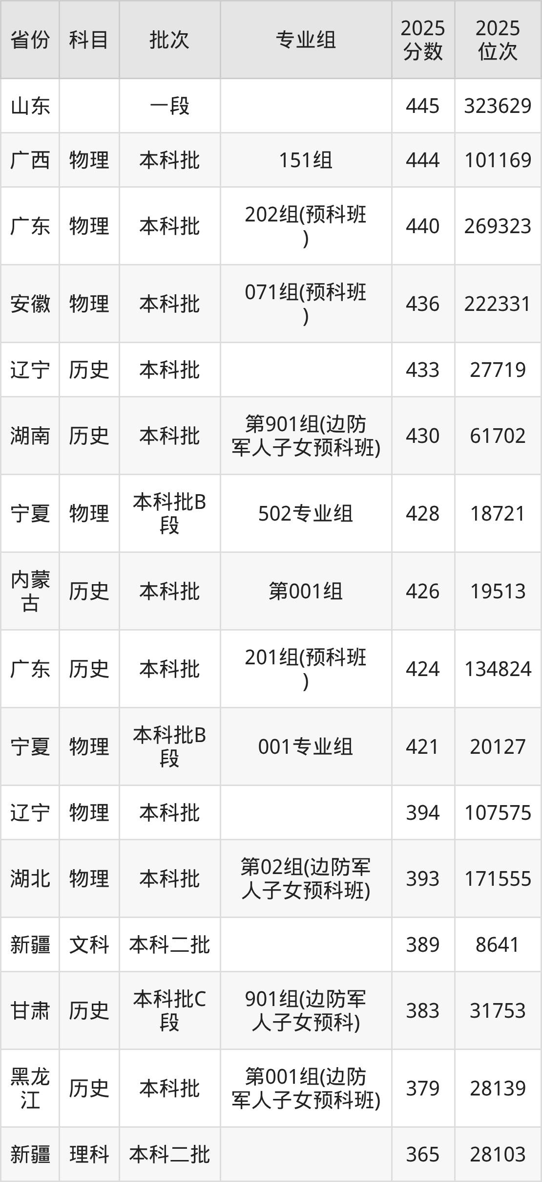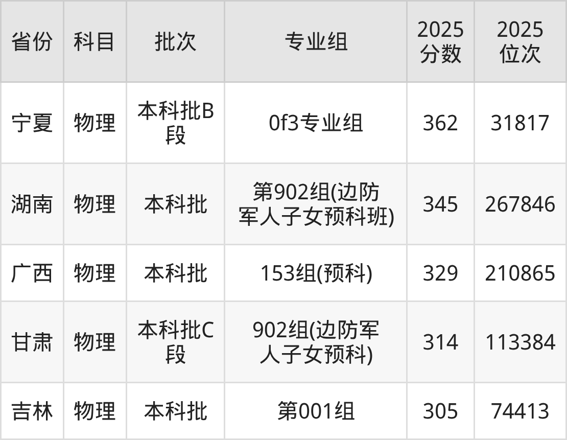 | 本科预科班 | 不限 | (边防军人子 女预科班) |