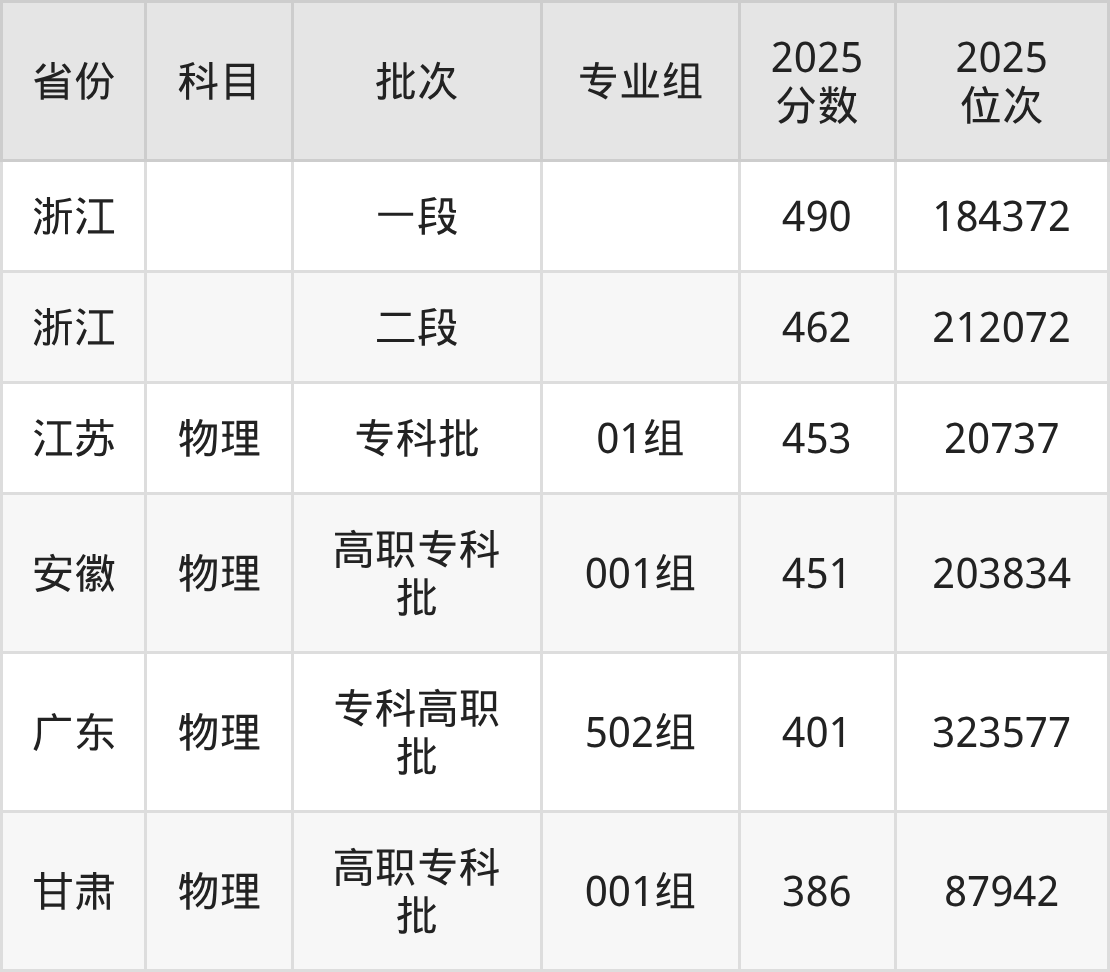 2025年安徽电气工程职业技术学院全国录取分数线386分到490分,录取最高在浙江、录取最低在甘肃(001组)。