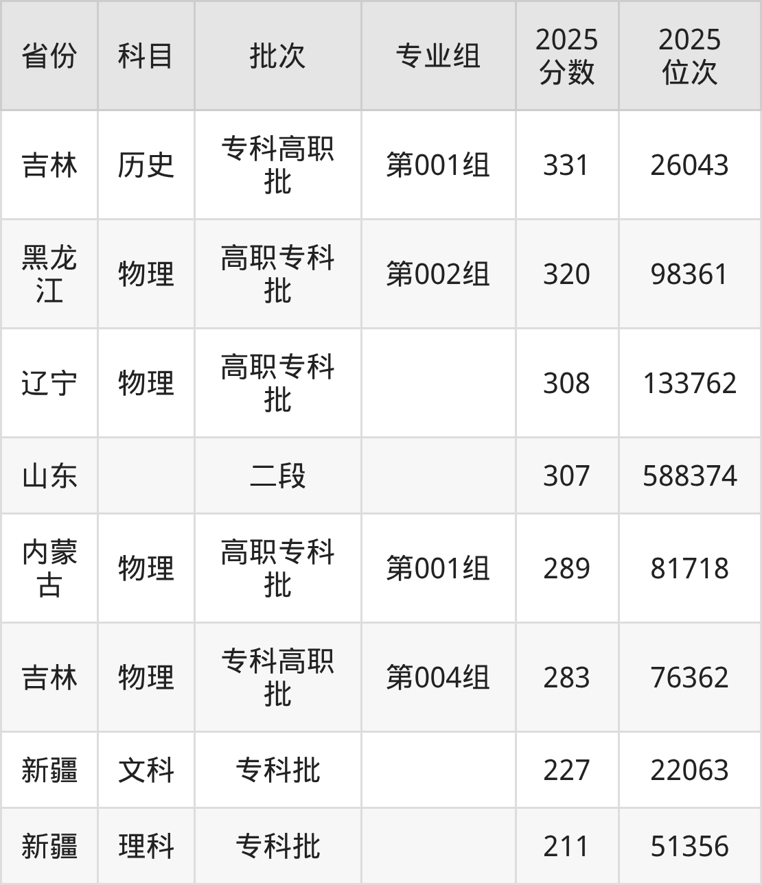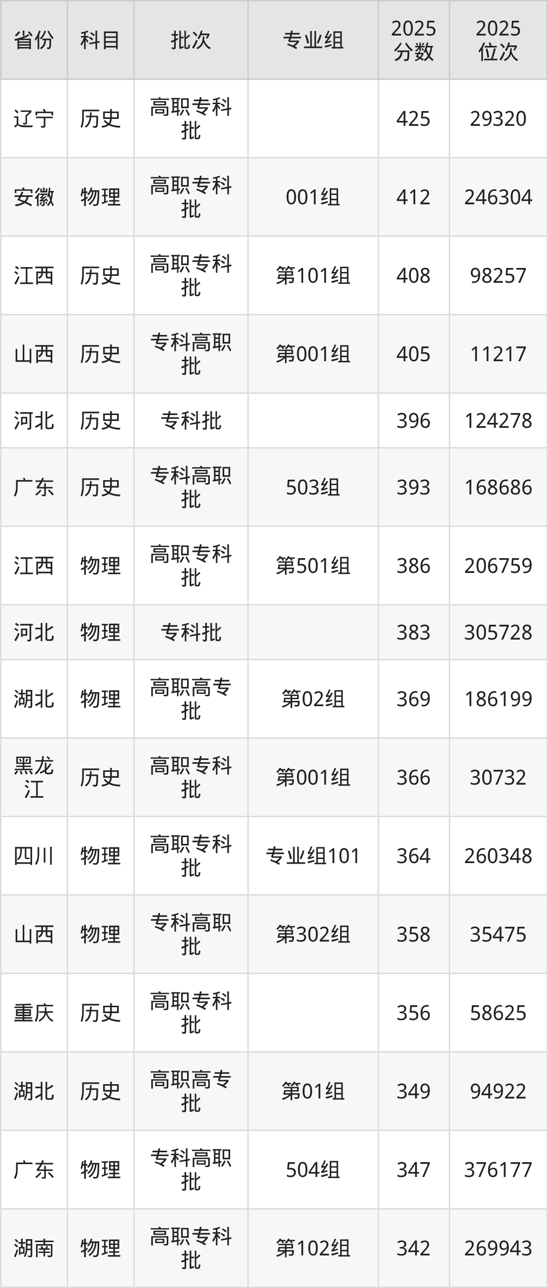 2025年河北建材职业技术学院全国录取分数线211分到425分,录取最高在辽宁(历史)、录取最低在新疆(理科)。