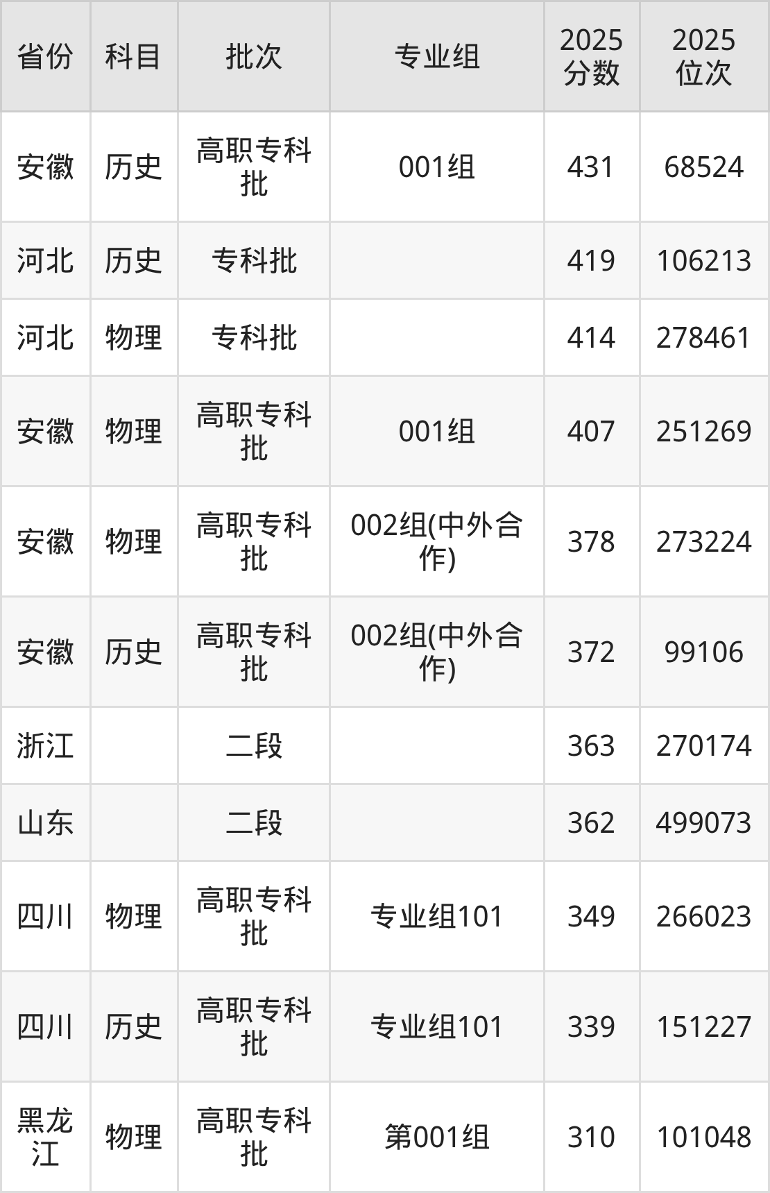 2025年安徽财贸职业学院全国录取分数线310分到431分,录取最高在安徽(001组)、录取最低在黑龙江(第001组)。