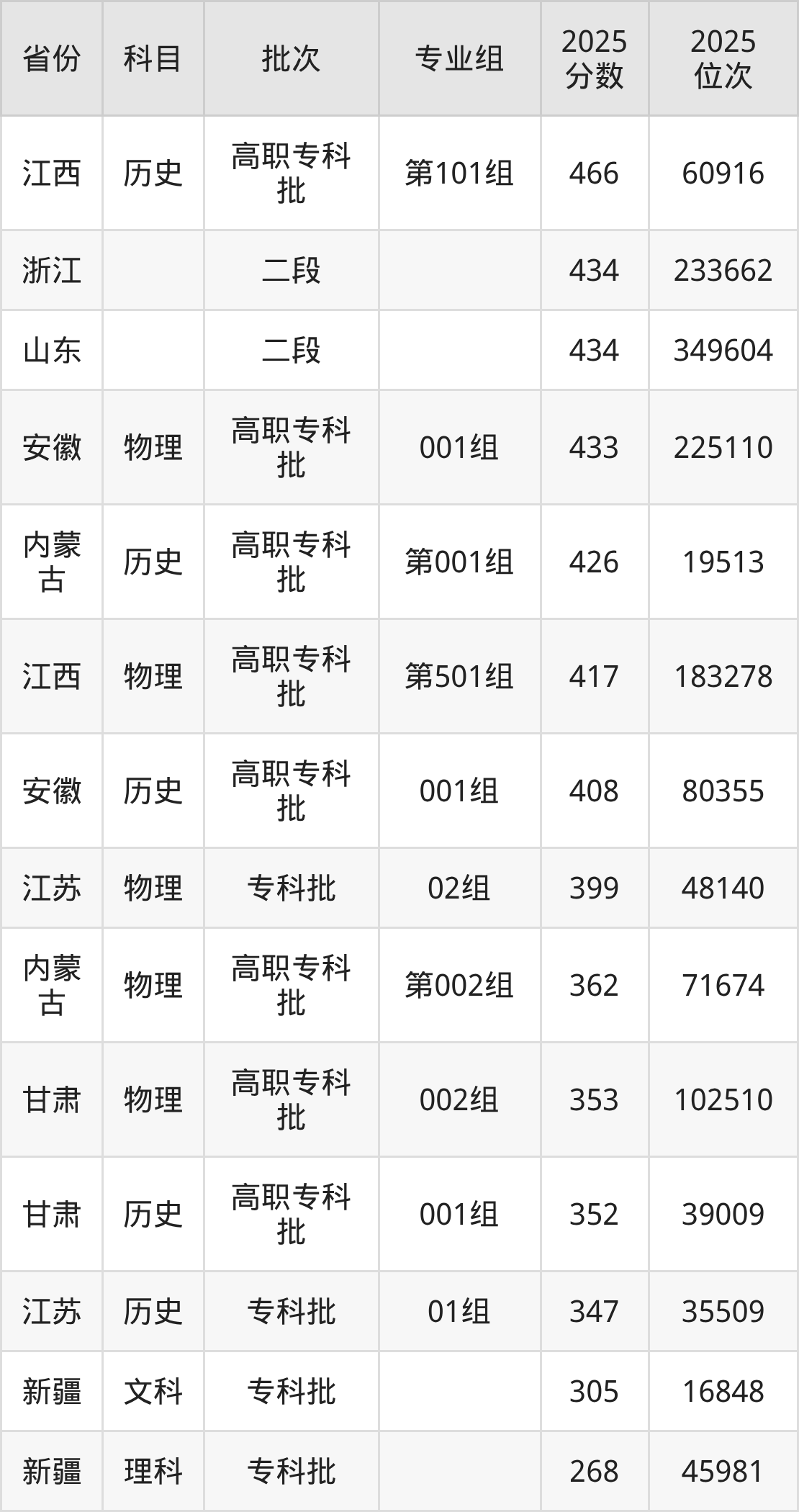 2025年河南职业技术学院全国录取分数线268分到466分,录取最高在江西(第101组)、录取最低在新疆(理科)。