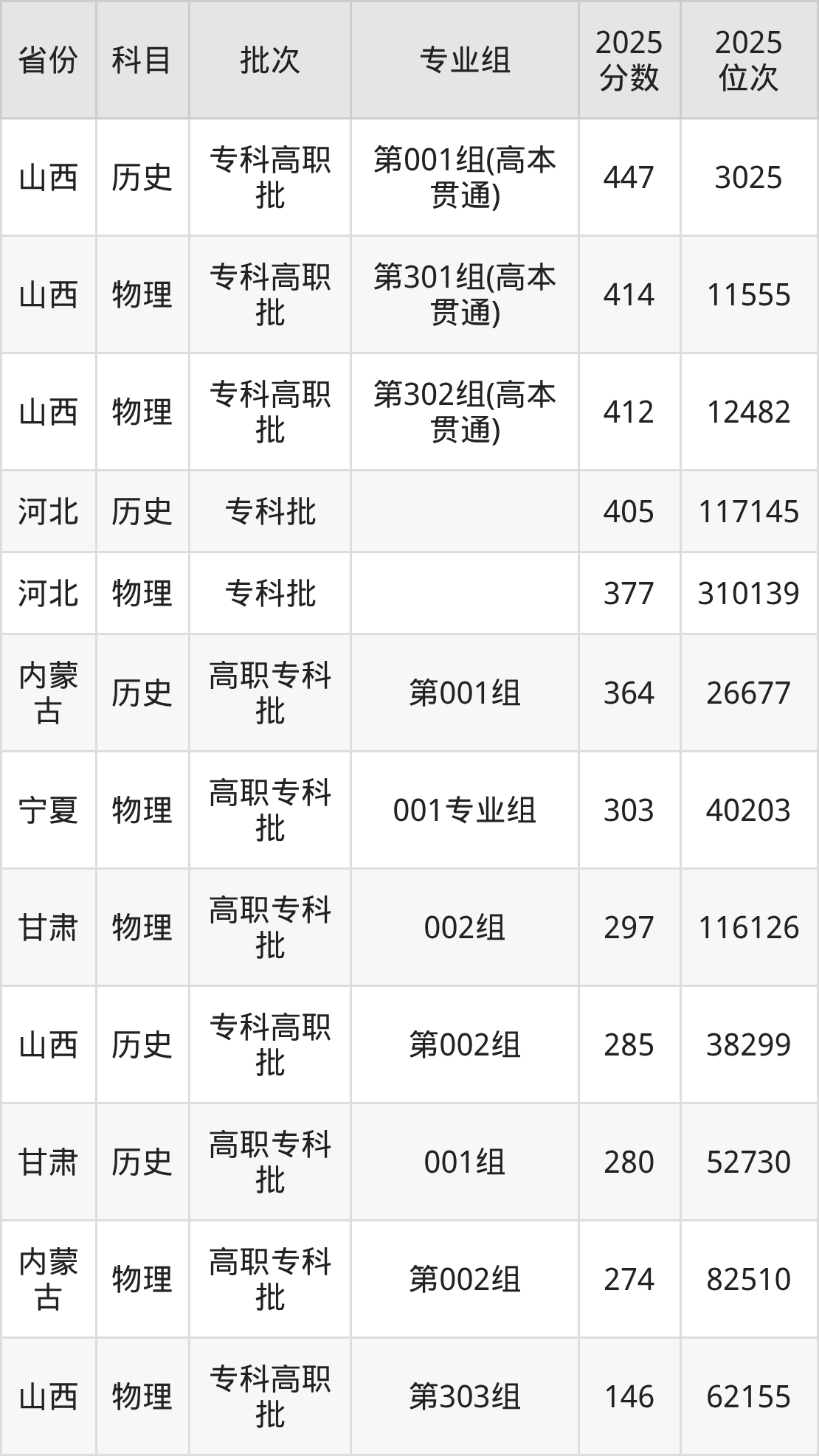 2025年山西林业职业技术学院全国录取分数线146分到447分,录取最高在山西(第001组(高本贯通))、录取最低在山西(第303组)。