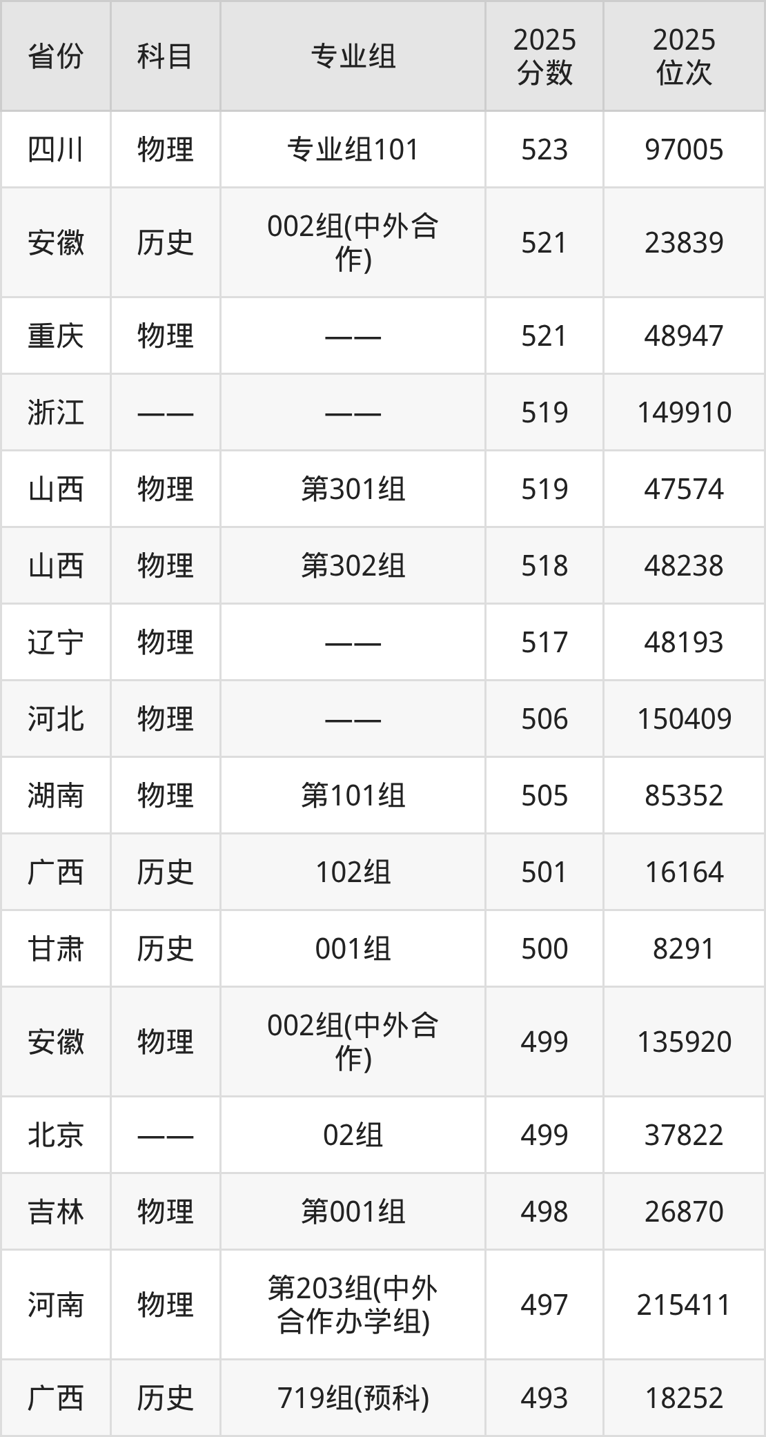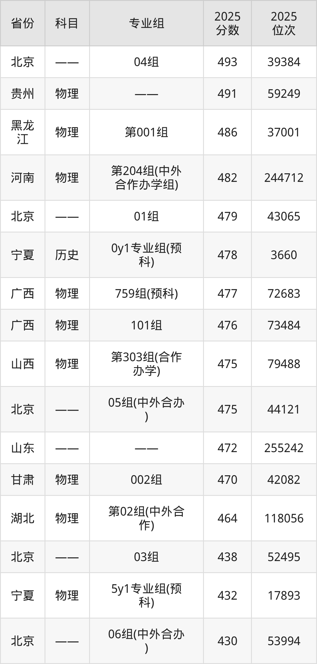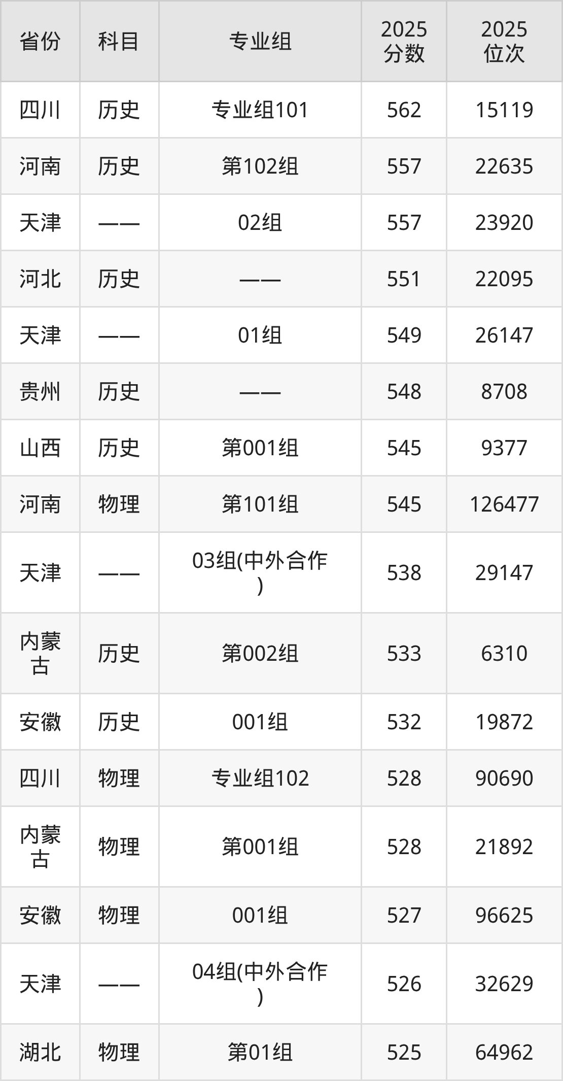 2025年北京农学院全国录取分数线419分到562分,录取最高在四川(历史类专业组101)、录取最低在湖南(物理类第202组(中外合作))。