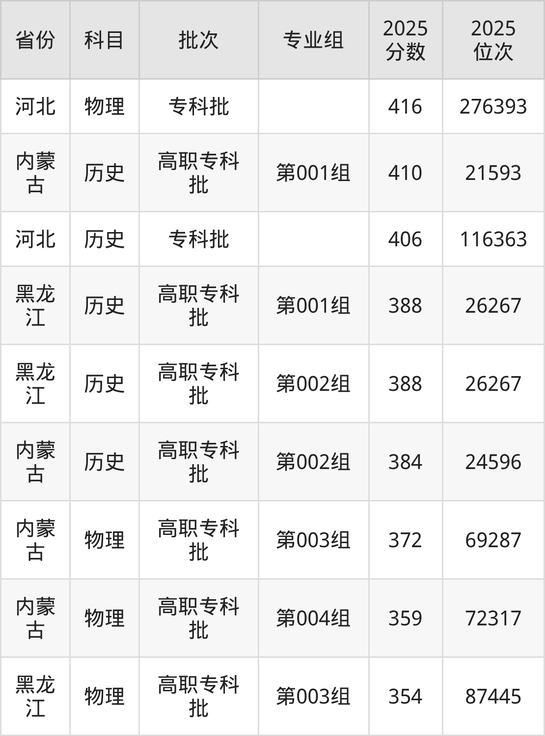 2025年北京劳动保障职业学院全国录取分数线354分到416分,录取最高在河北(物理)、录取最低在黑龙江(第003组)。