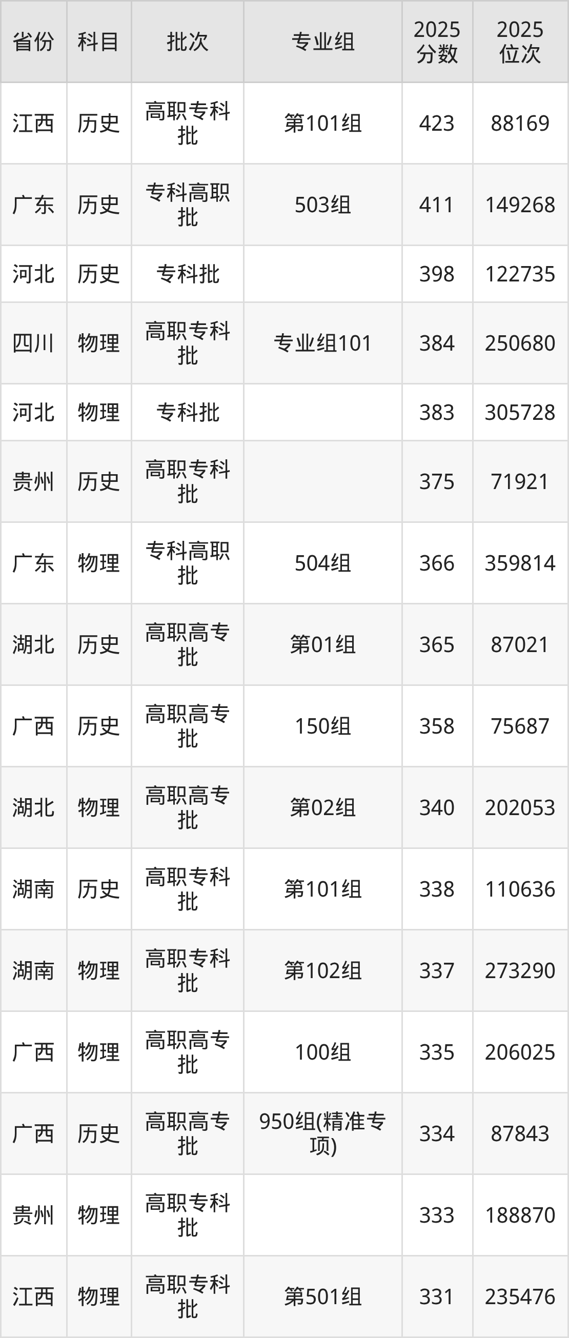 2025年广西建设职业技术学院全国录取分数线150分到423分,录取最高在江西(第101组)、录取最低在四川(专业组101)。