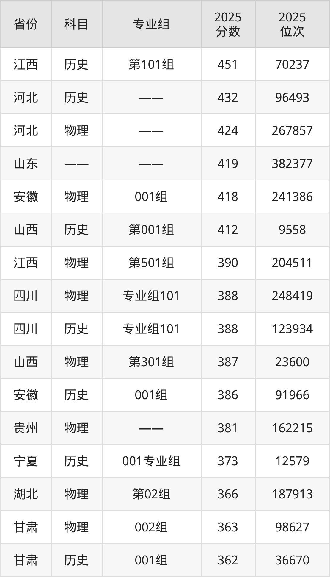 2025年陕西机电职业技术学院全国录取分数线206分到451分,录取最高在江西(历史类第101组)、录取最低在新疆(理科)。