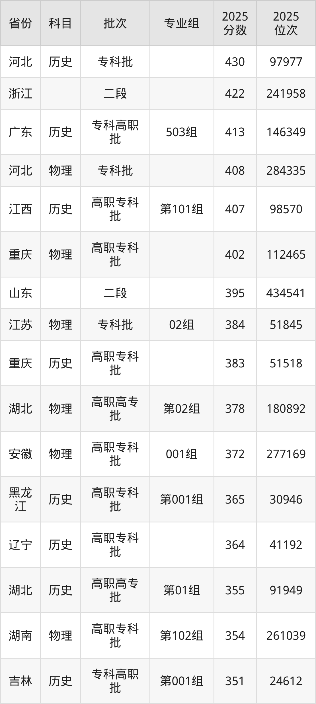 2025年天津国土资源和房屋职业学院全国录取分数线146分到430分,录取最高在河北(历史)、录取最低在新疆(理科)。