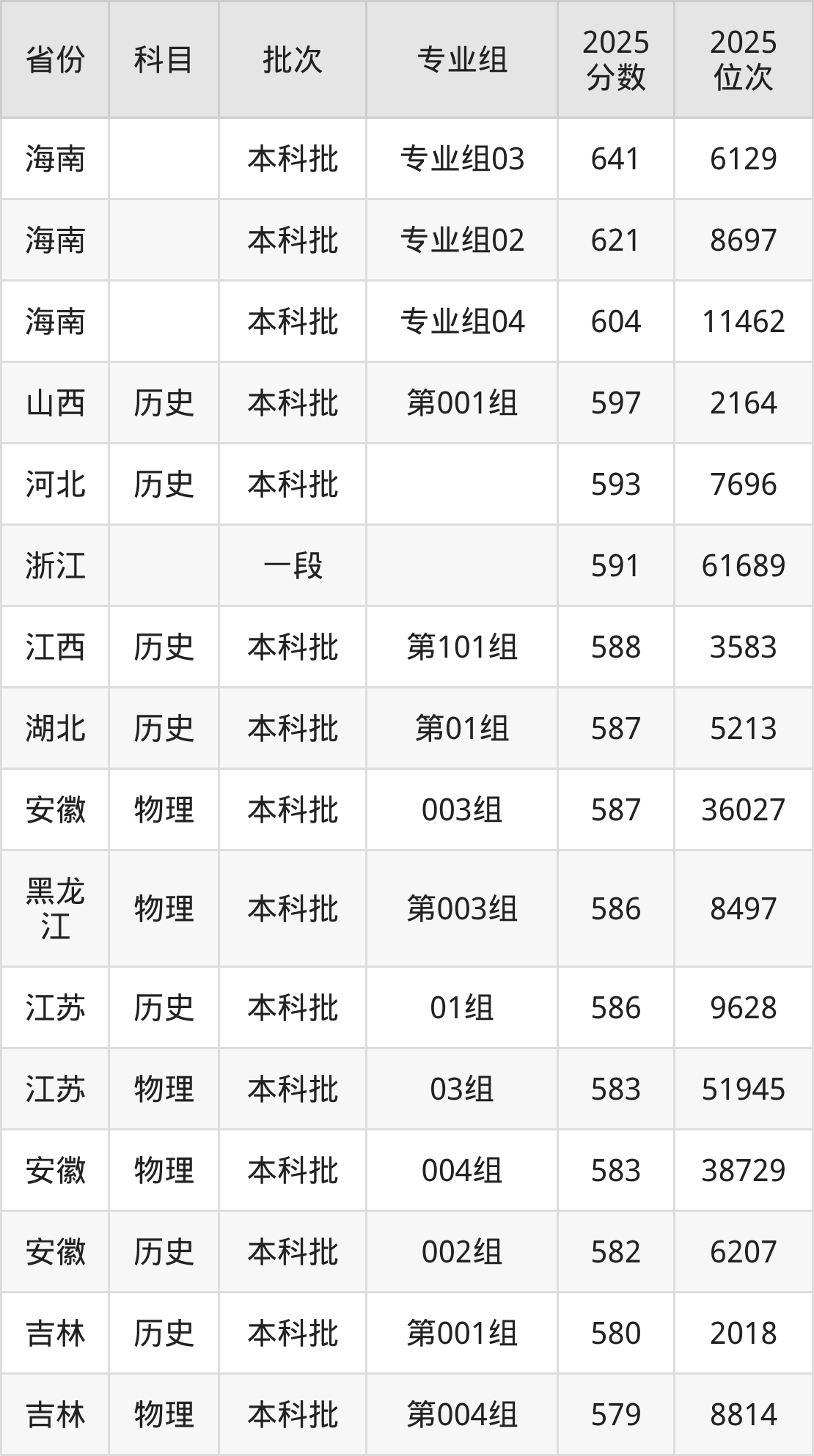 2025年浙江工商大学全国录取分数线461分到641分,录取最高在海南(专业组03)、录取最低在甘肃(005组)。