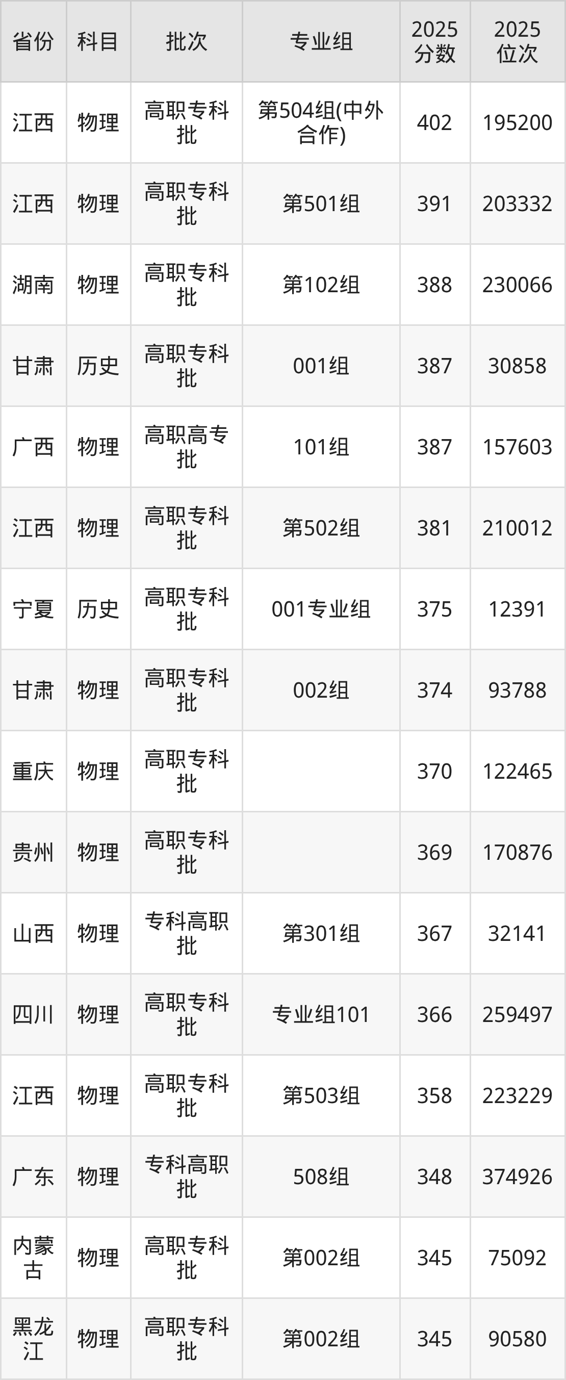 参考2025年山东省高考招录数据,按照分数线从高到低依次为大家展示宜春职业技术学院各个专业录取分数线。