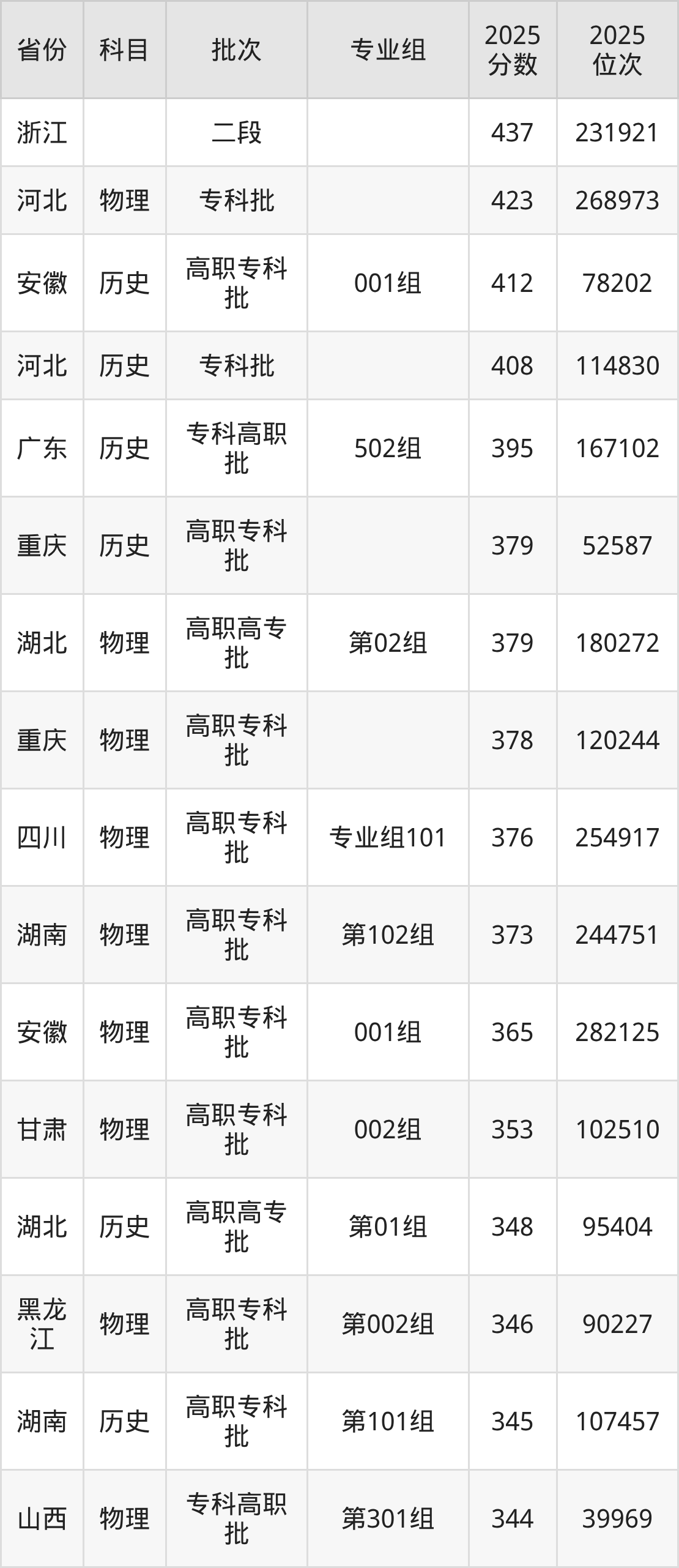 2025年宣城职业技术学院全国录取分数线306分到437分,录取最高在浙江、录取最低在甘肃(001组)。