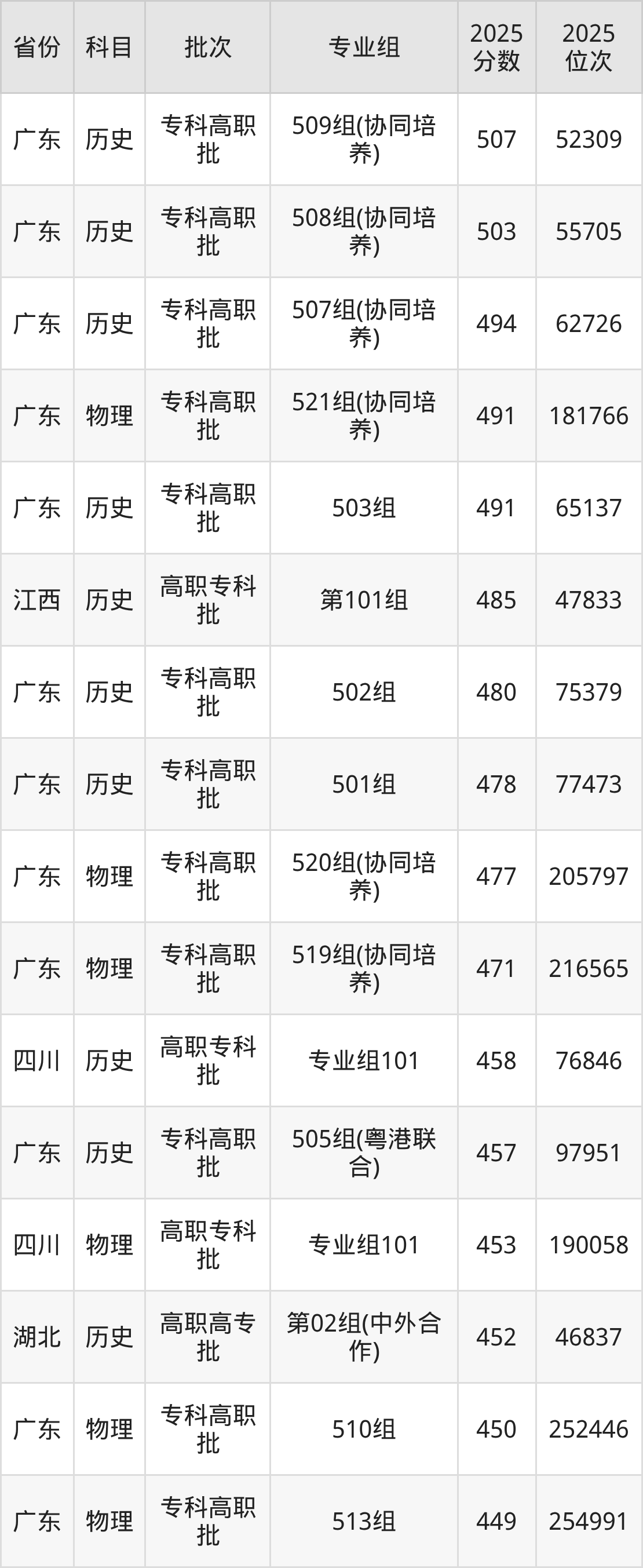 参考2025年吉林省高考招录数据,按照分数线从高到低依次为大家展示广东科学技术职业学院各个专业录取分数线。