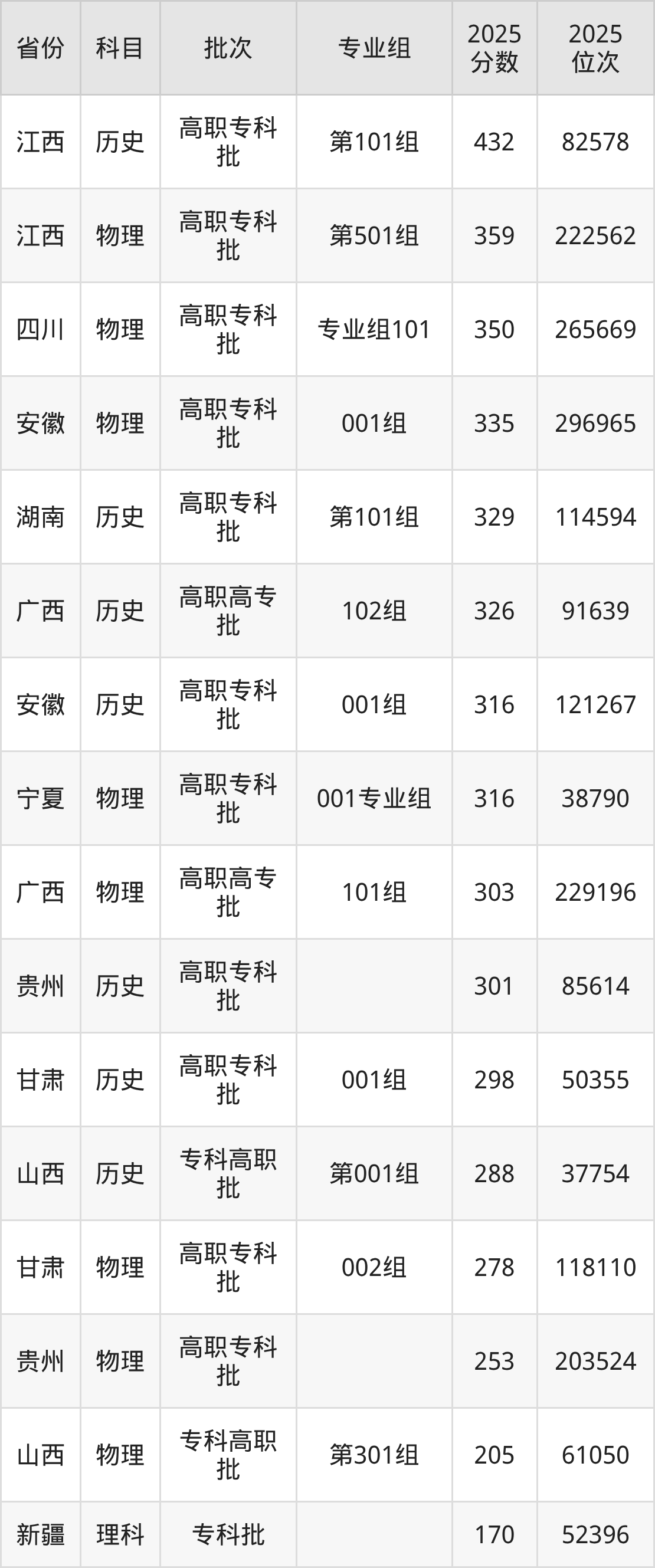2025年闽北职业技术学院全国录取分数线170分到432分,录取最高在江西(第101组)、录取最低在新疆(理科)。