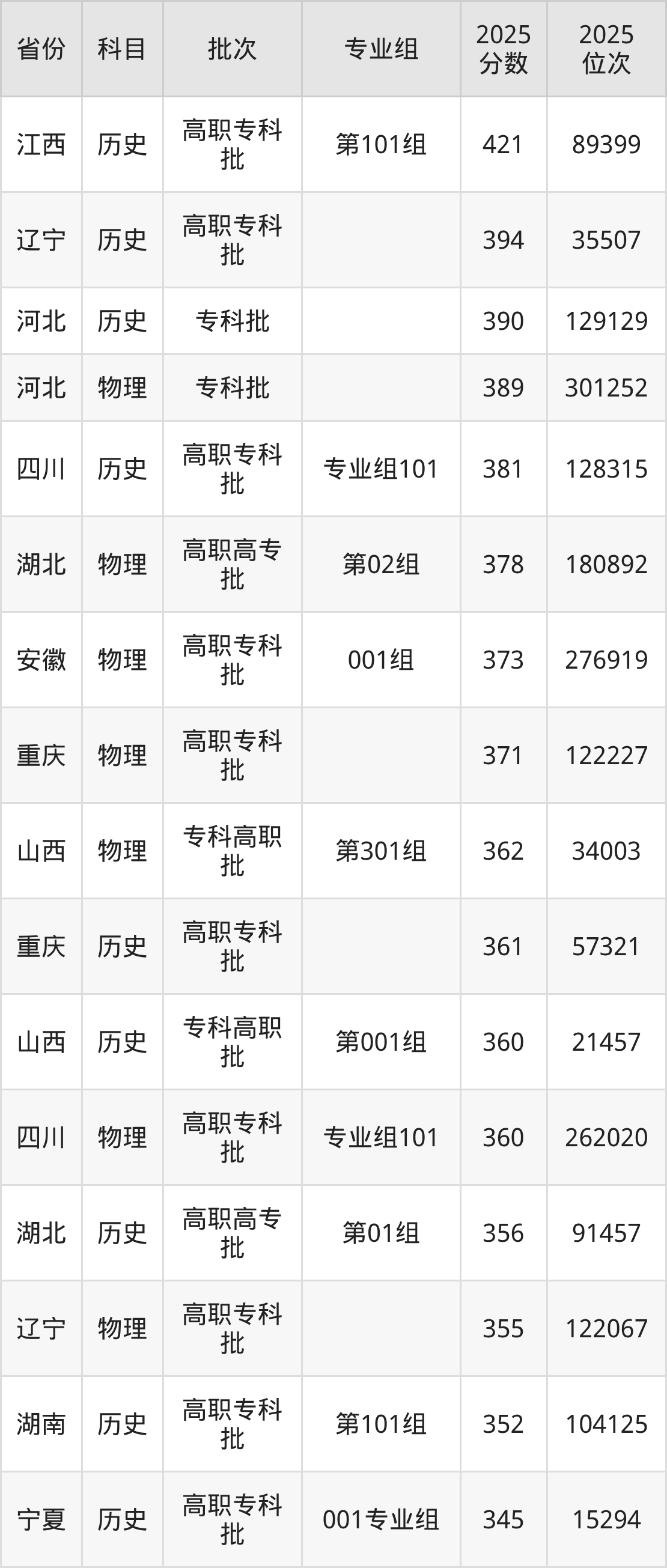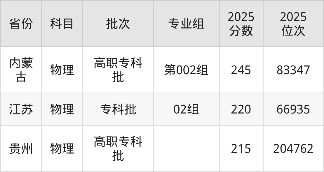 2025年济源职业技术学院全国录取分数线215分到421分,录取最高在江西(第101组)、录取最低在贵州(物理)。
