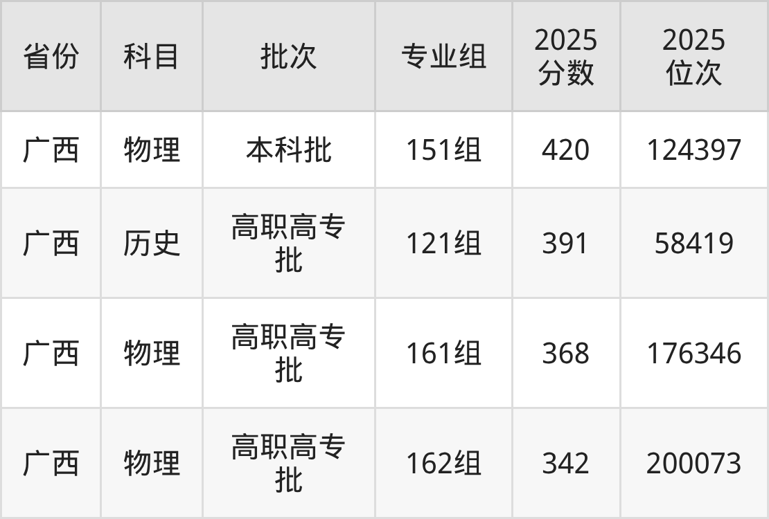 参考2025年贵州省高考招录数据,按照分数线从高到低依次为大家展示广西职业师范学院各个专业录取分数线。