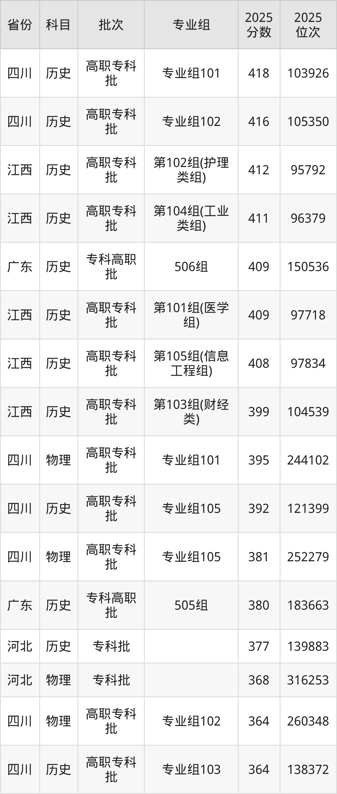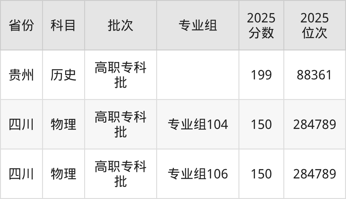 2025年六盘水职业技术学院全国录取分数线150分到418分,录取最高在四川(专业组101)、录取最低在四川(专业组106)。