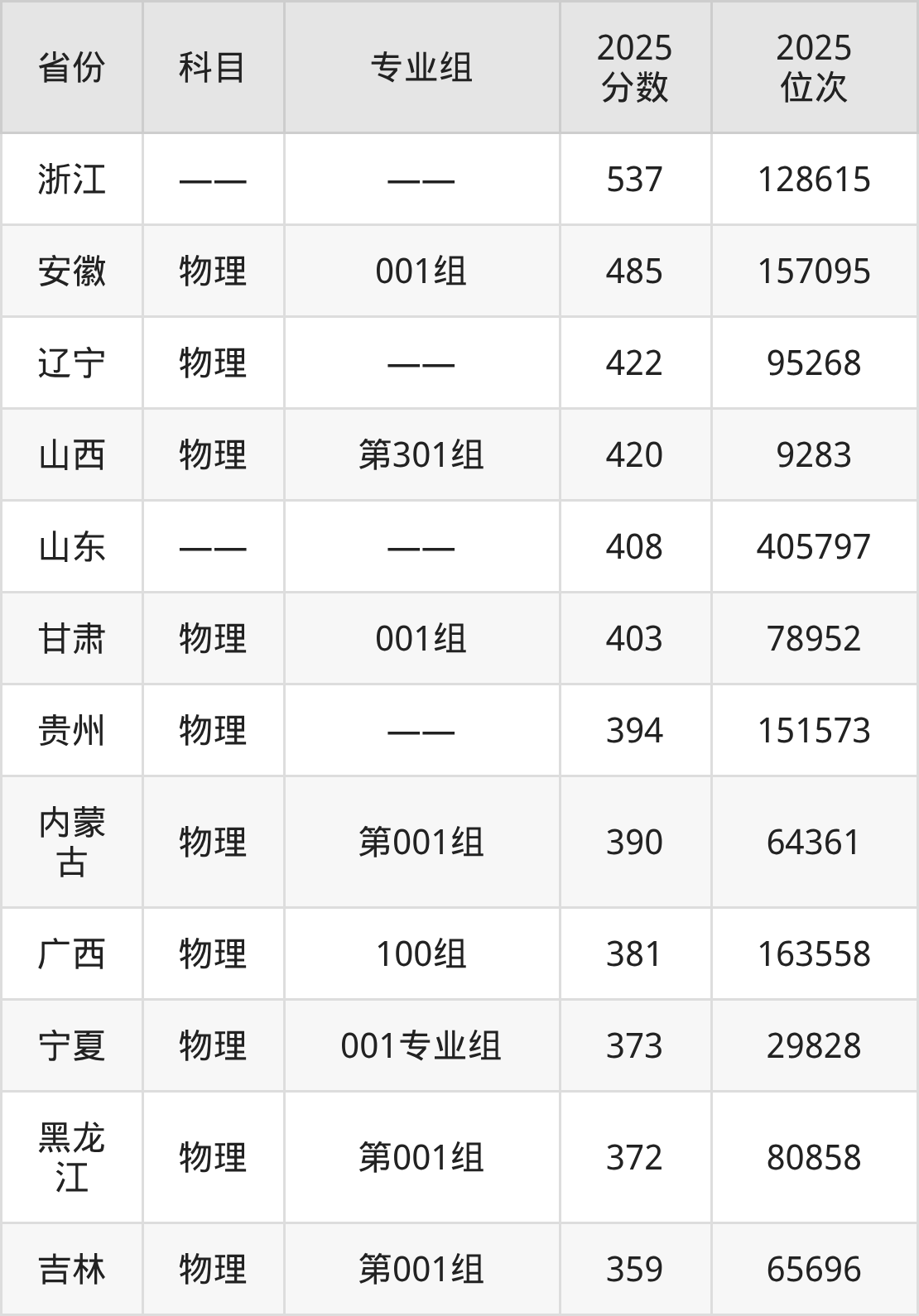 2025年山东医学高等专科学校全国录取分数线359分到537分,录取最高在浙江、录取最低在吉林(物理类第001组)。