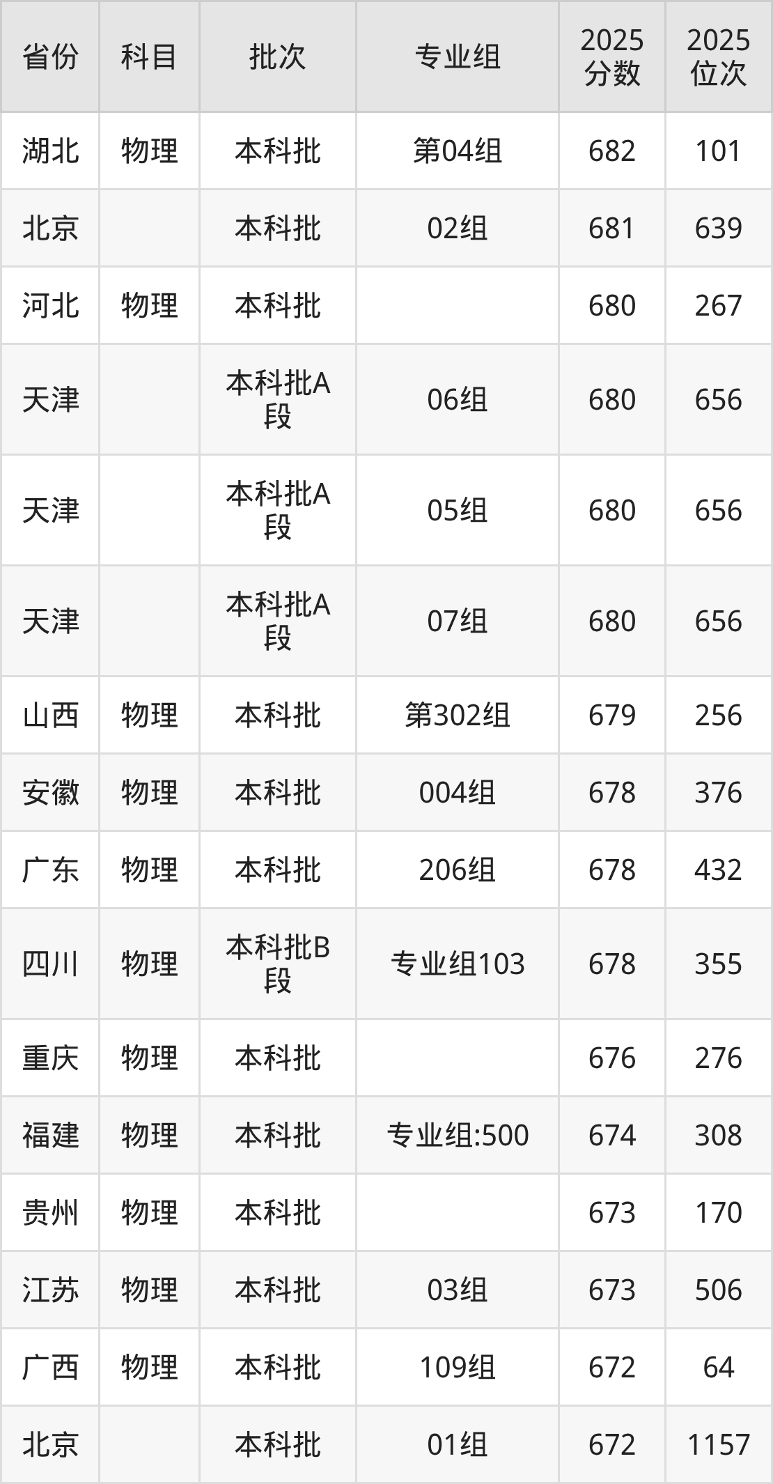 9、理科试验班类(物理方向)(包含专业:物理学、天文学):676分、位次487名;