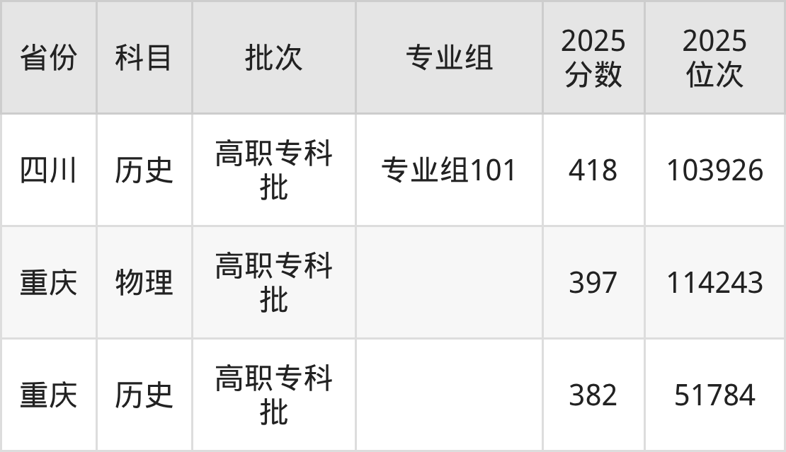 2025年重庆文化艺术职业学院全国录取分数线382分到418分,录取最高在四川(专业组101)、录取最低在重庆(历史)。