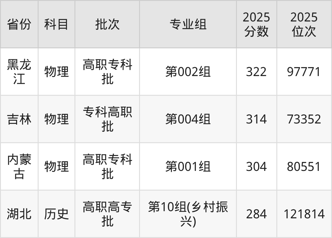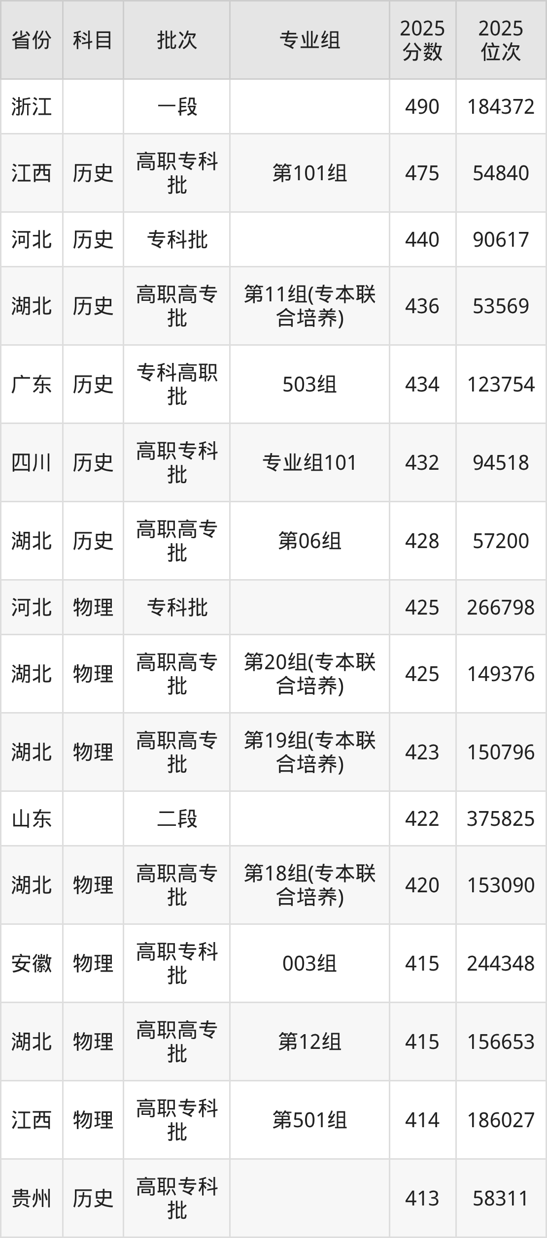 2025年武汉交通职业学院全国录取分数线284分到490分,录取最高在浙江、录取最低在湖北(第10组(乡村振兴))。