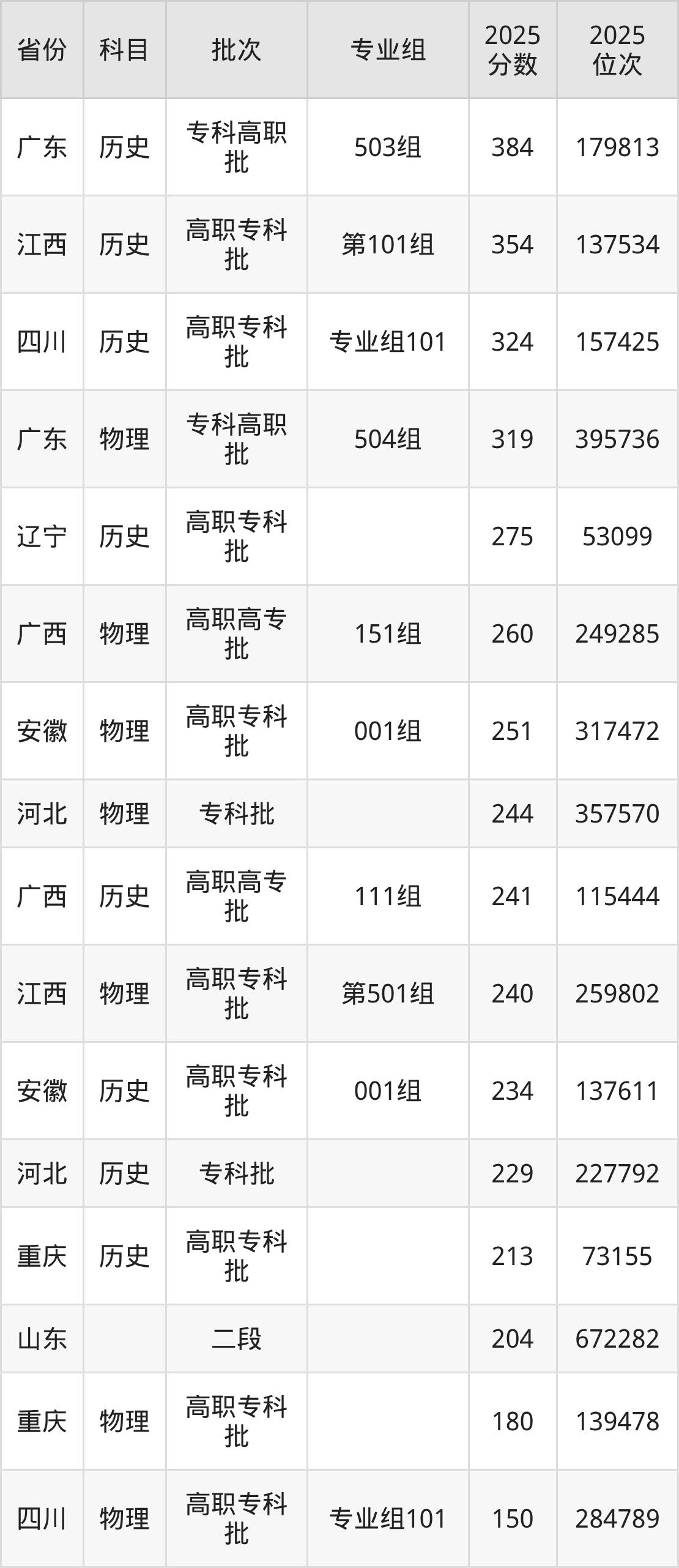 2025年北海康养职业学院全国录取分数线150分到384分,录取最高在广东(503组)、录取最低在四川(专业组101)。