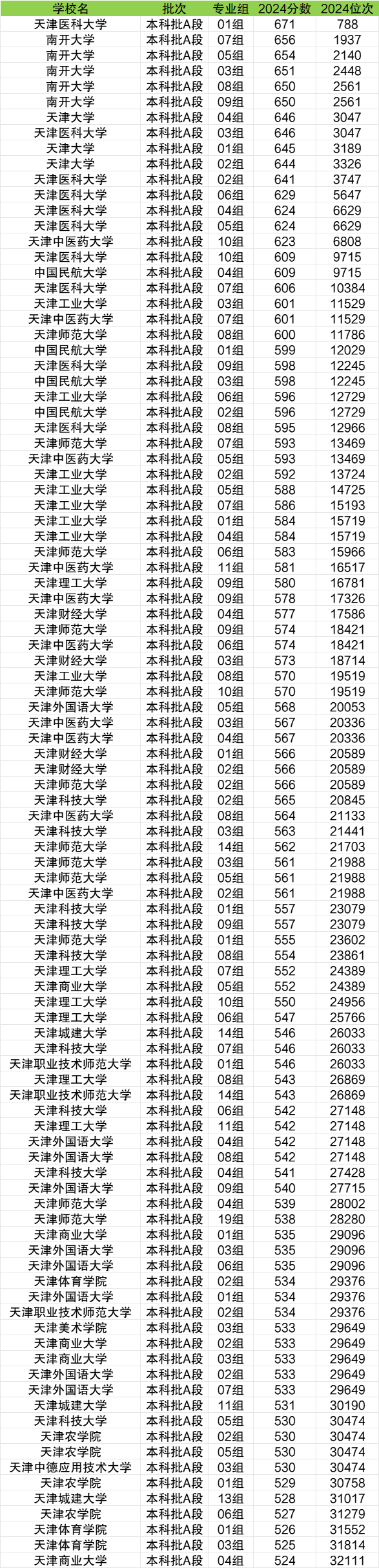 想要知道2025年该填报哪所大学,需要了解往年大学在天津的最低录取分数线及位次情况,碍于篇幅限制,本文仅收集了2024年天津市内公办大学招收本科生的最低分数线及位次信息(分数线TOP100专业组)。