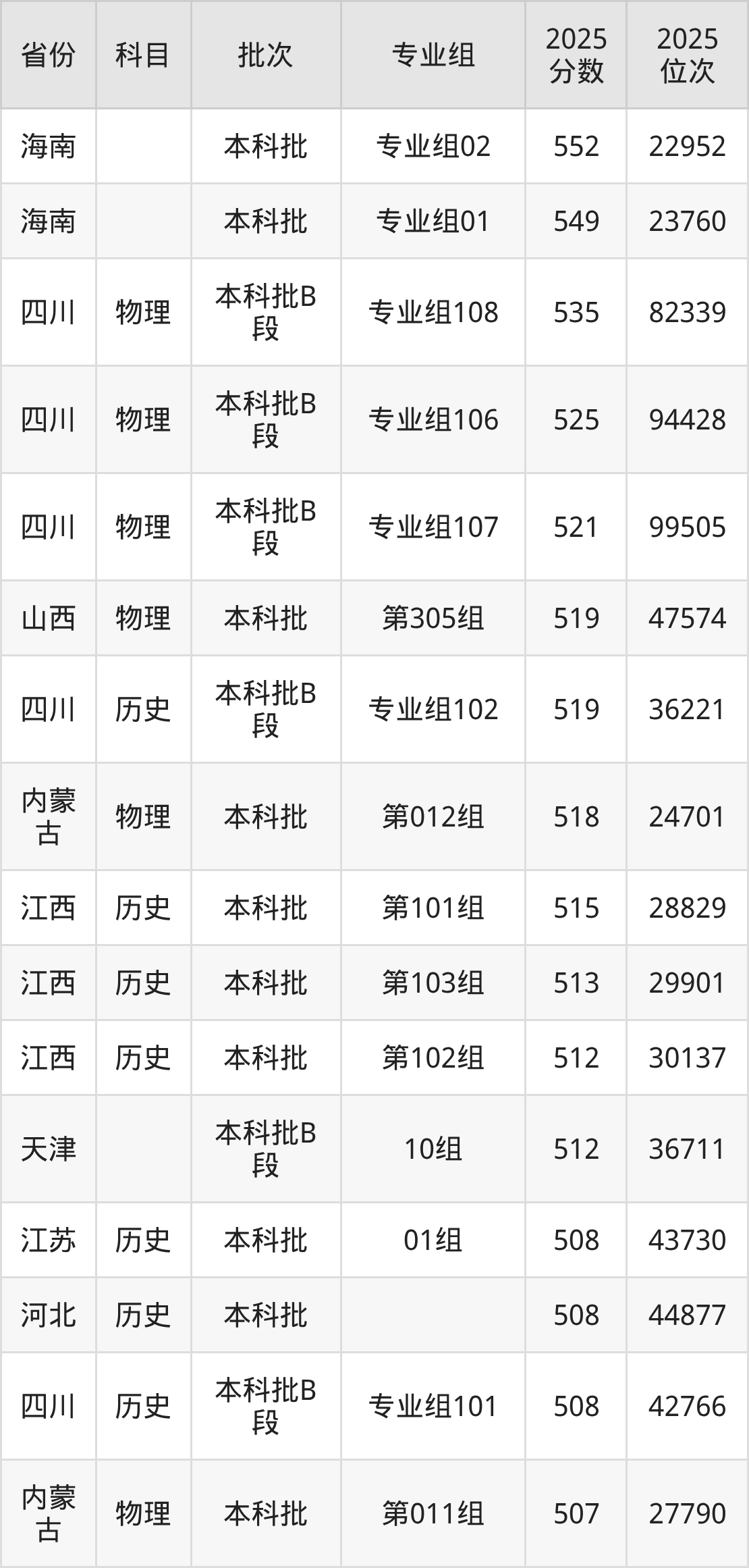 2025年齐鲁医药学院全国录取分数线150分到552分,录取最高在海南(专业组02)、录取最低在四川(专业组104)。