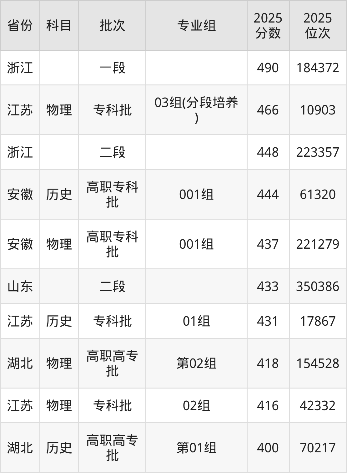 2025年常州工程职业技术学院全国录取分数线400分到490分,录取最高在浙江、录取最低在湖北(第01组)。