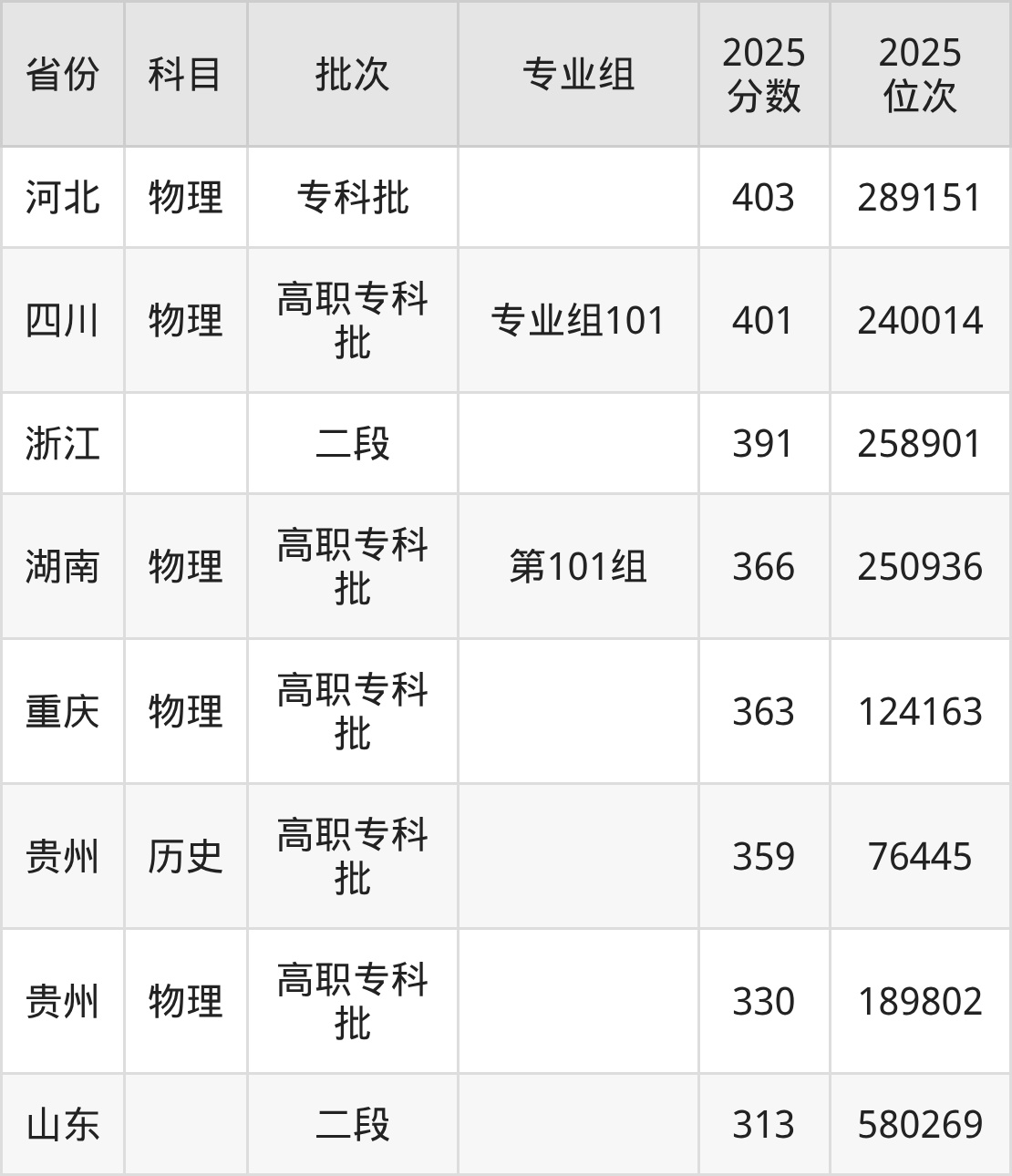 2025年贵州工业职业技术学院全国录取分数线313分到403分,录取最高在河北(物理)、录取最低在山东。