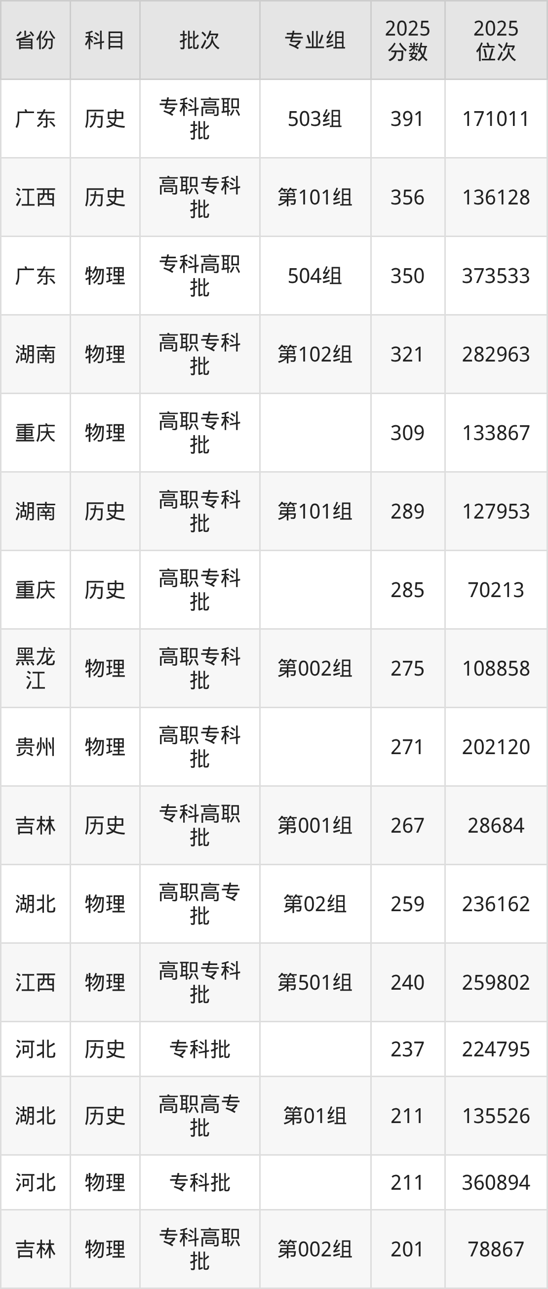 2025年广西理工职业技术学院全国录取分数线171分到391分,录取最高在广东(503组)、录取最低在黑龙江(第001组)。
