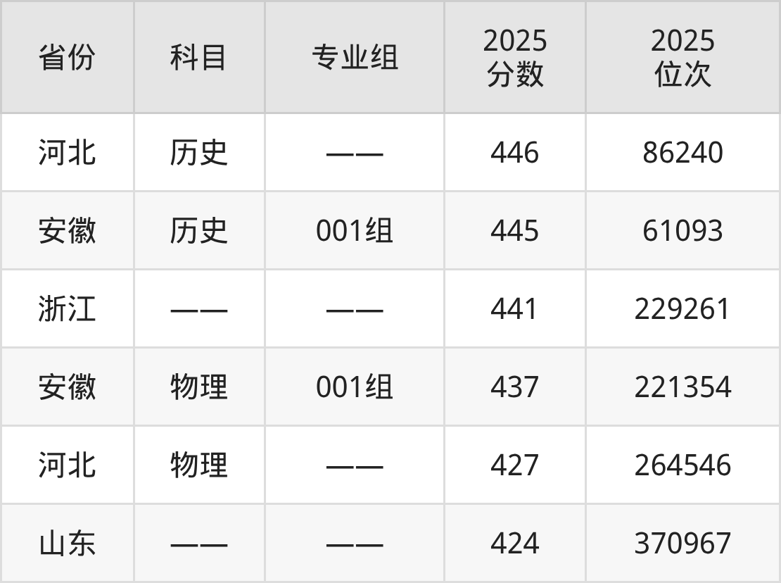 2025年安徽商贸职业技术学院全国录取分数线424分到446分,录取最高在河北(历史类)、录取最低在山东。