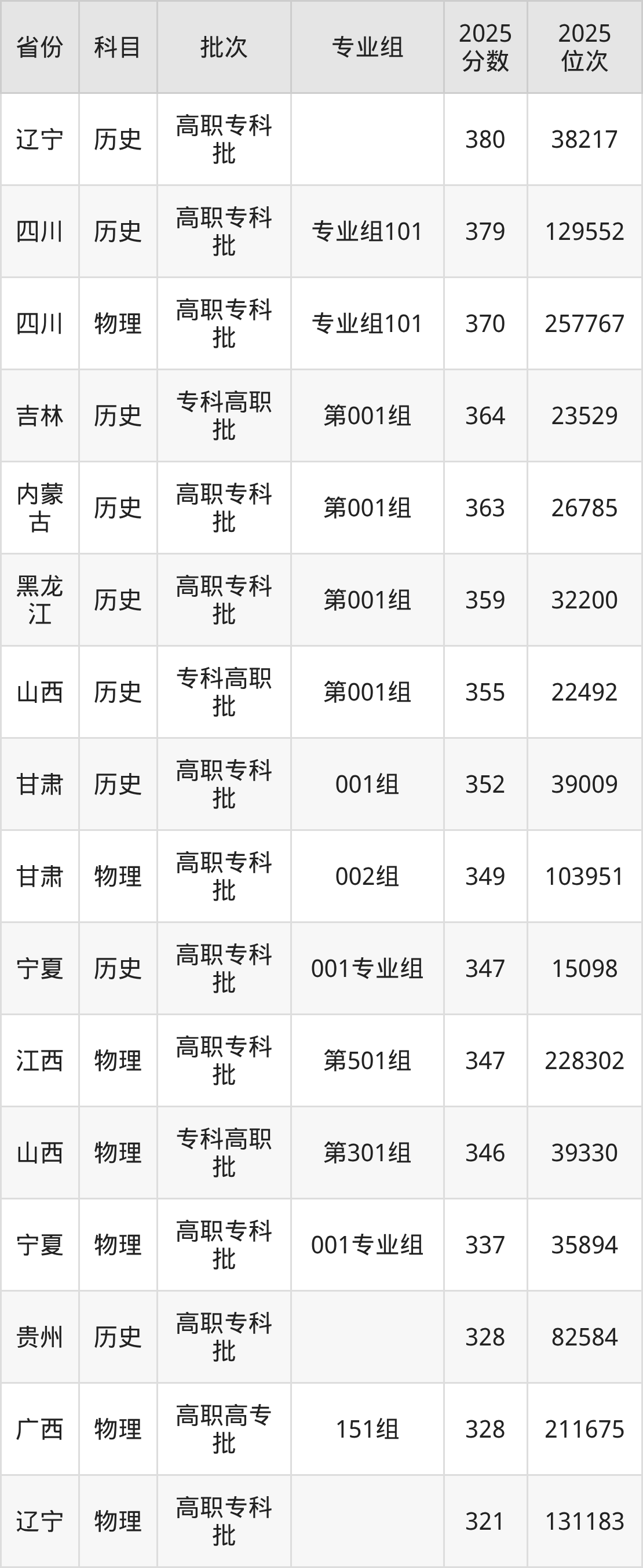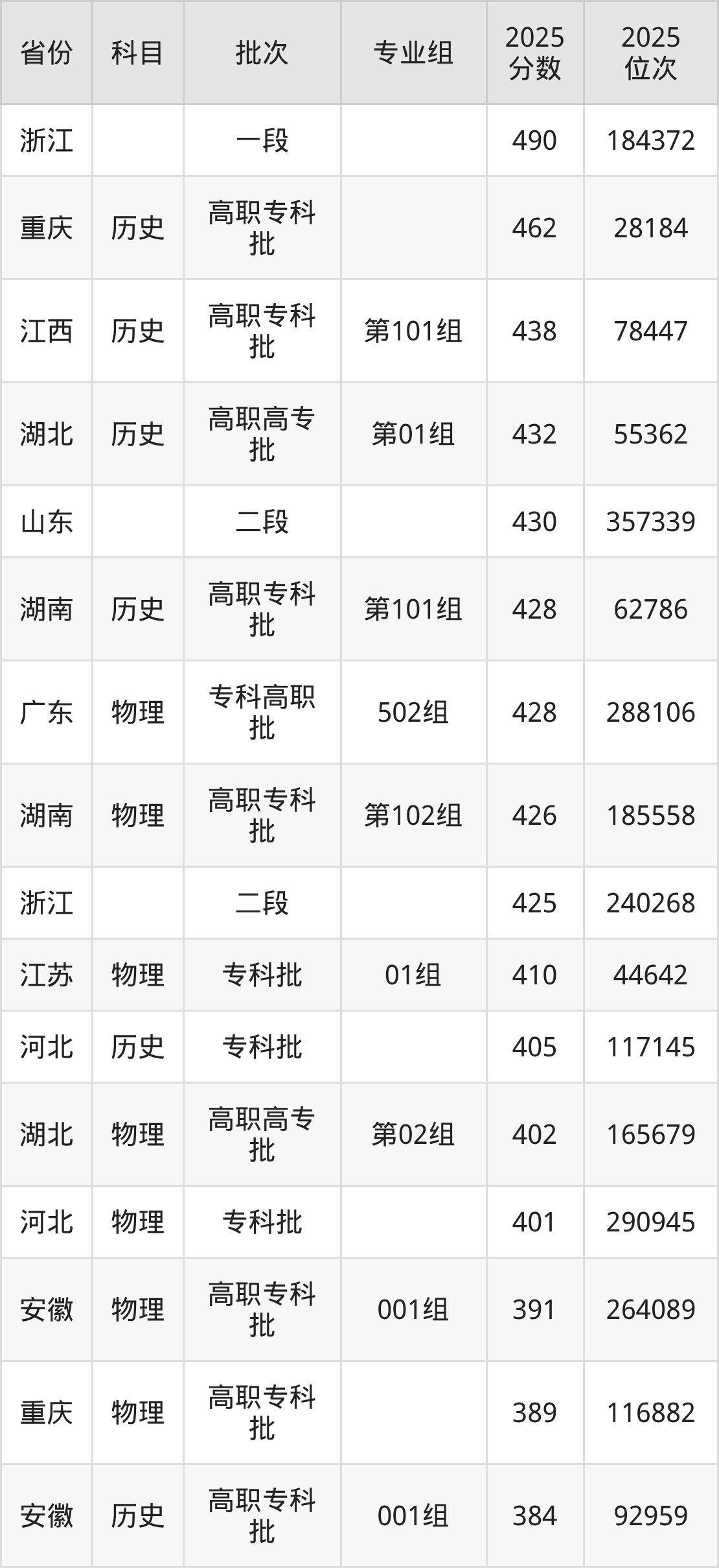 2025年天津城市职业学院全国录取分数线177分到490分,录取最高在浙江、录取最低在新疆(文科)。