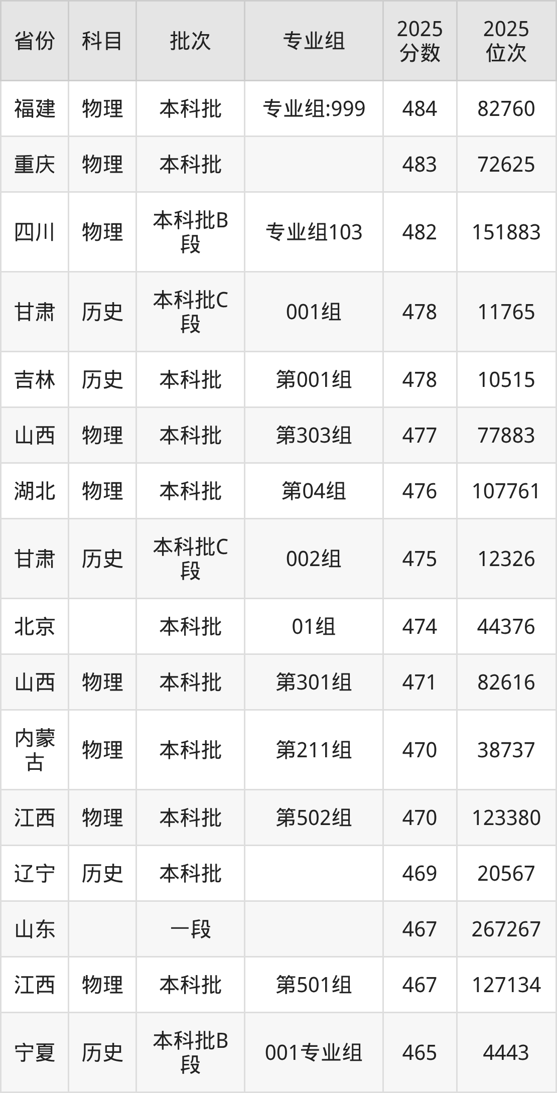 2025年新疆政法学院各专业录取分数线从467分到528分不等,录取分数线最低的专业是数学与应用数学;录取分数线最高的专业是监狱学。本文将展示新疆政法学院所有专业最低分数线及位次,供2026届高考生参考。