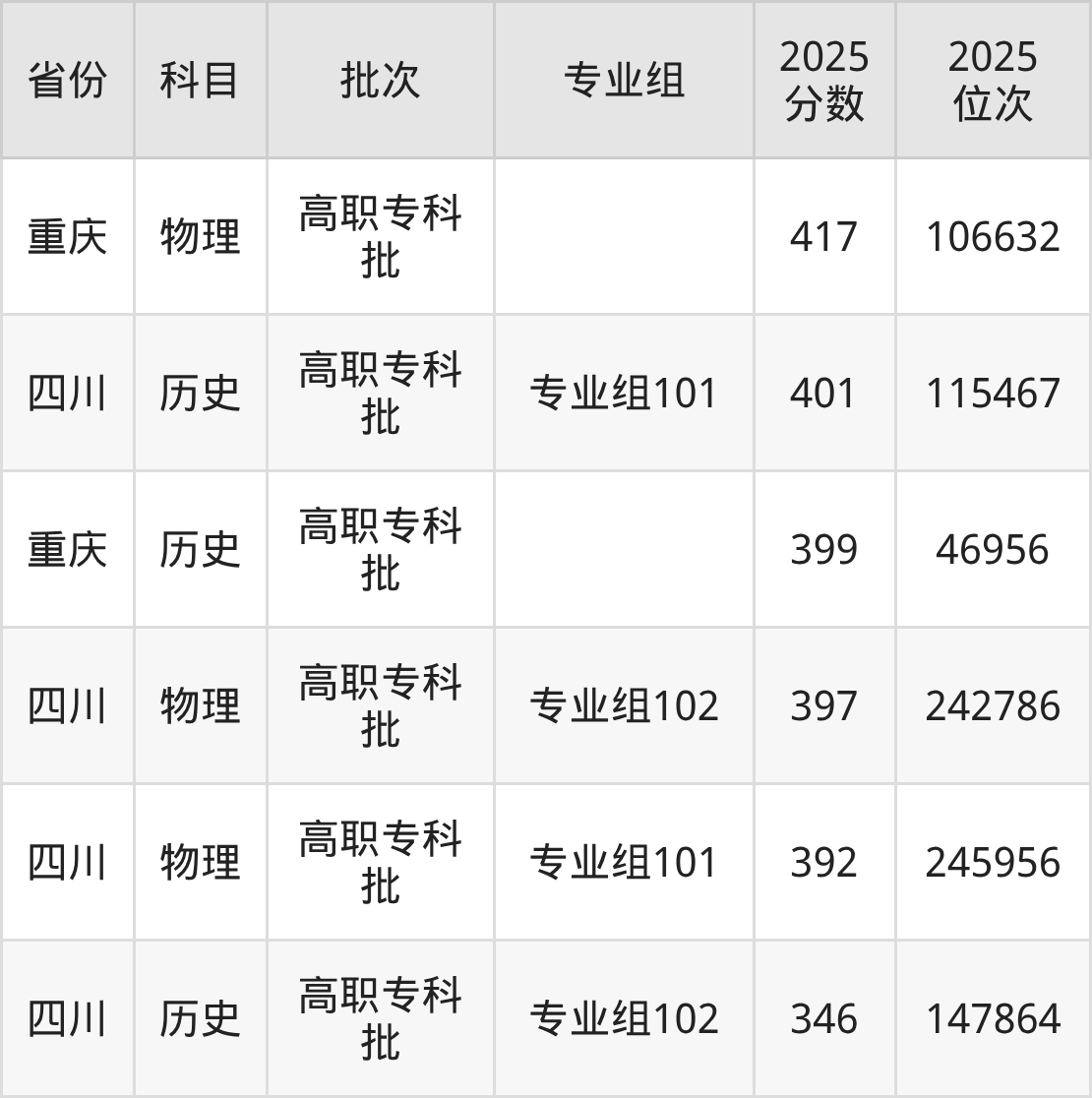 2025年四川机电职业技术学院全国录取分数线346分到417分,录取最高在重庆(物理)、录取最低在四川(专业组102)。