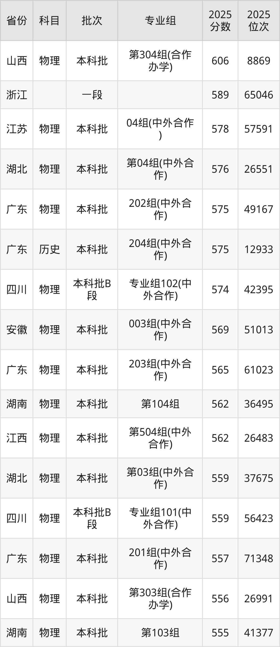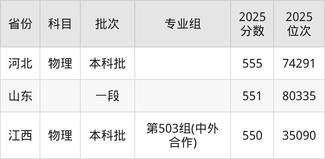 2025年深圳北理莫斯科大学全国录取分数线550分到606分,录取最高在山西(第304组(合作办学))、录取最低在江西(第503组(中外合作))。