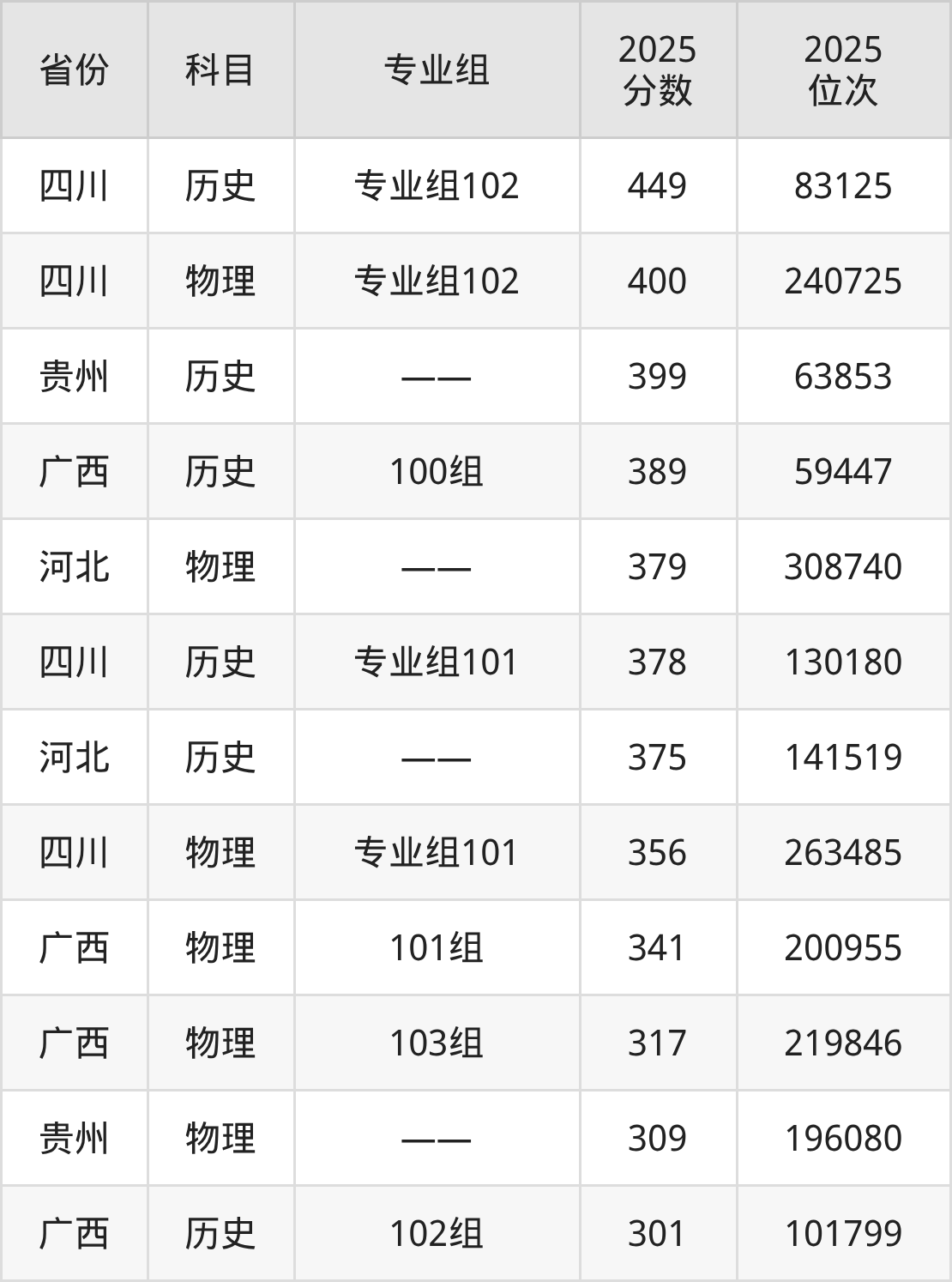 2025年云南特殊教育职业学院全国录取分数线301分到449分,录取最高在四川(历史类专业组102)、录取最低在广西(历史类102组)。