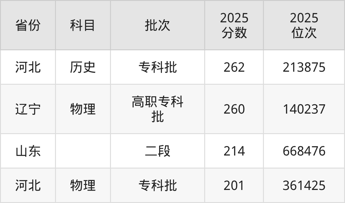 2025年沧州航空职业学院全国录取分数线201分到262分,录取最高在河北(历史)、录取最低在河北(物理)。