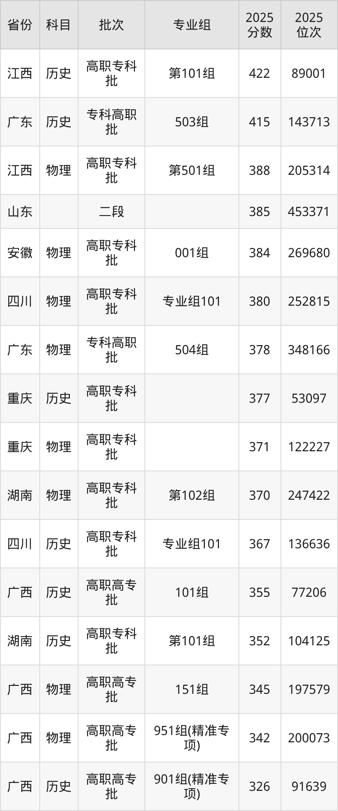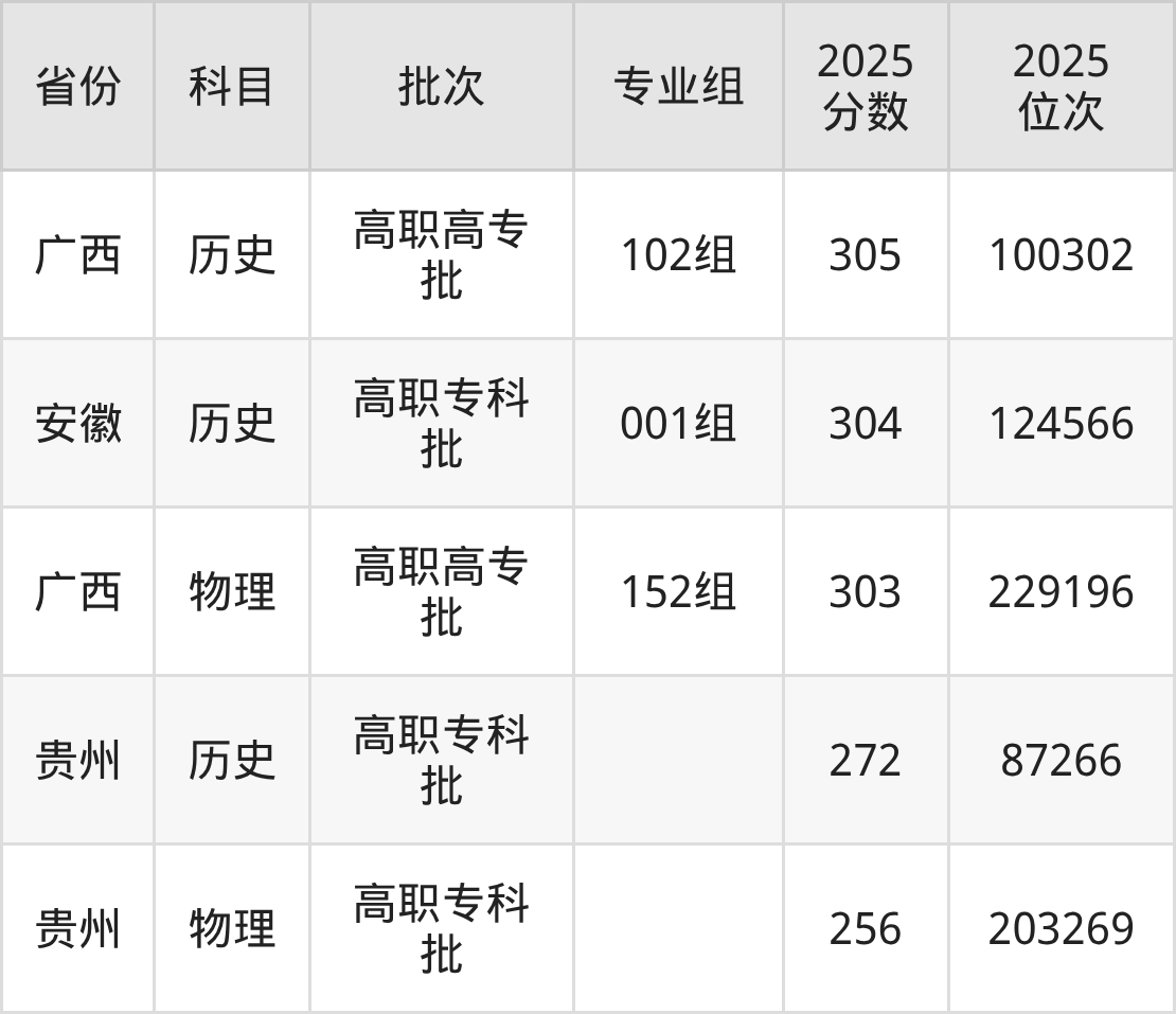 2025年广西工业职业技术学院全国录取分数线256分到422分,录取最高在江西(第101组)、录取最低在贵州(物理)。