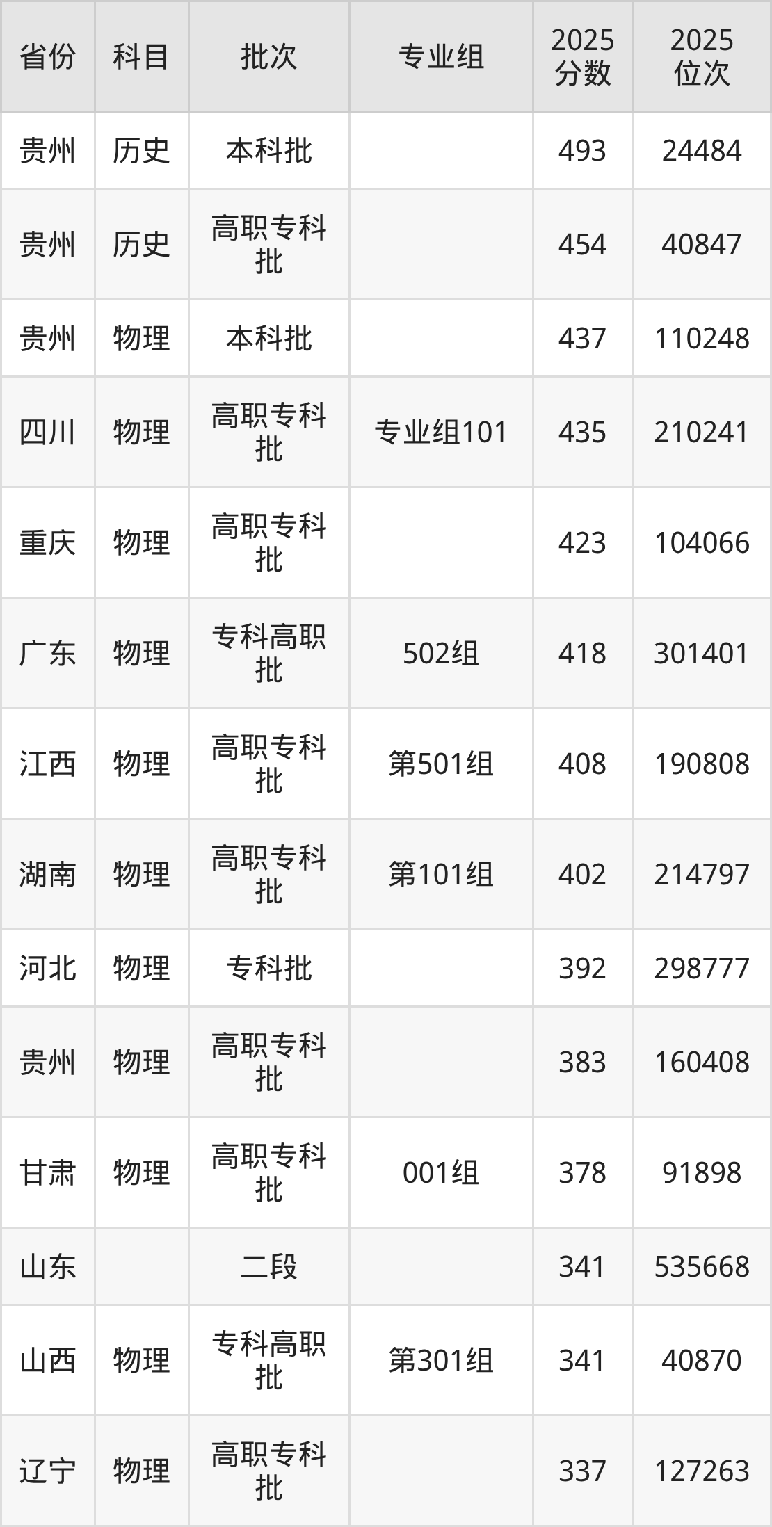 2025年贵州交通职业大学全国录取分数线337分到493分,录取最高在贵州(历史)、录取最低在辽宁(物理)。