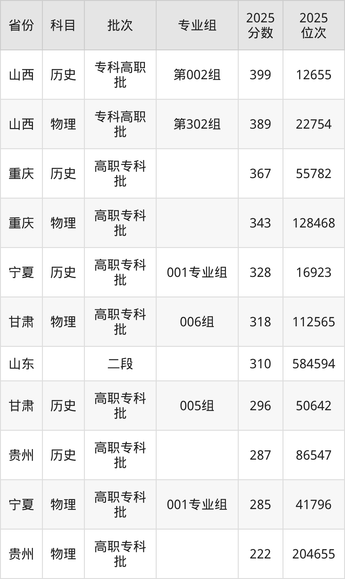2025年泰山职业技术学院全国录取分数线222分到399分,录取最高在山西(第002组)、录取最低在贵州(物理)。