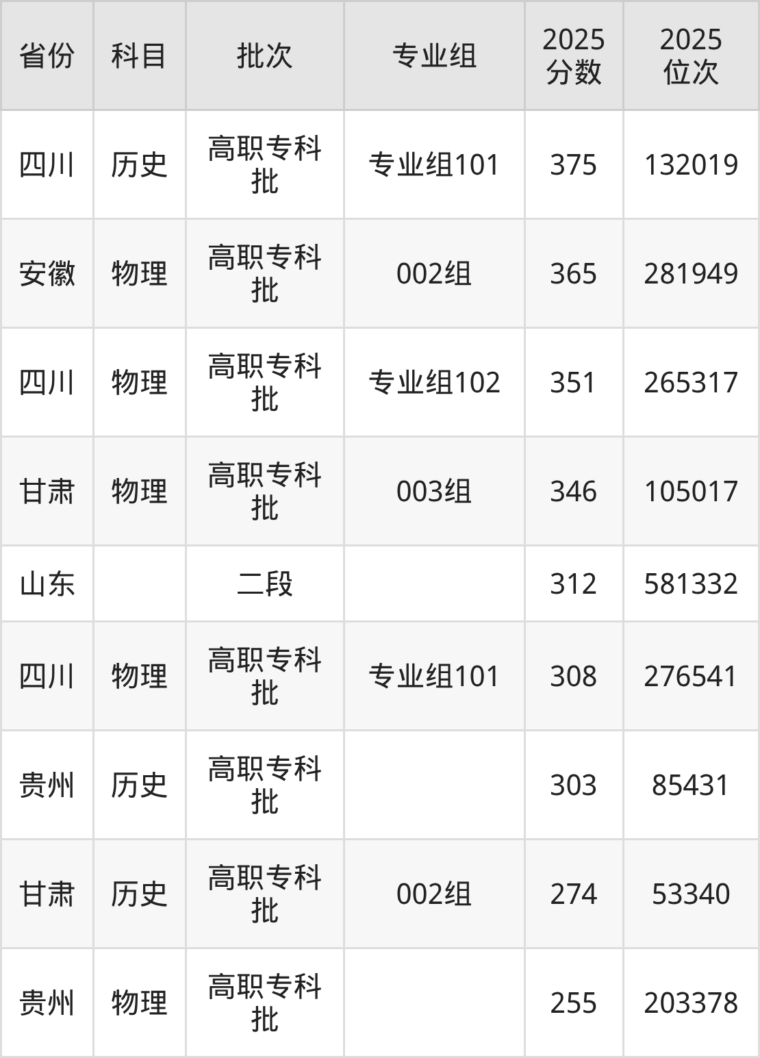 2025年潍坊工程职业学院全国录取分数线255分到375分,录取最高在四川(专业组101)、录取最低在贵州(物理)。