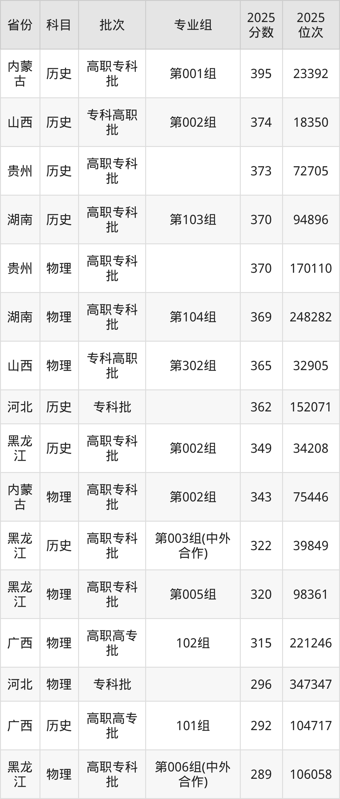 2025年山东信息职业技术学院全国录取分数线280分到395分,录取最高在内蒙古(第001组)、录取最低在山东。