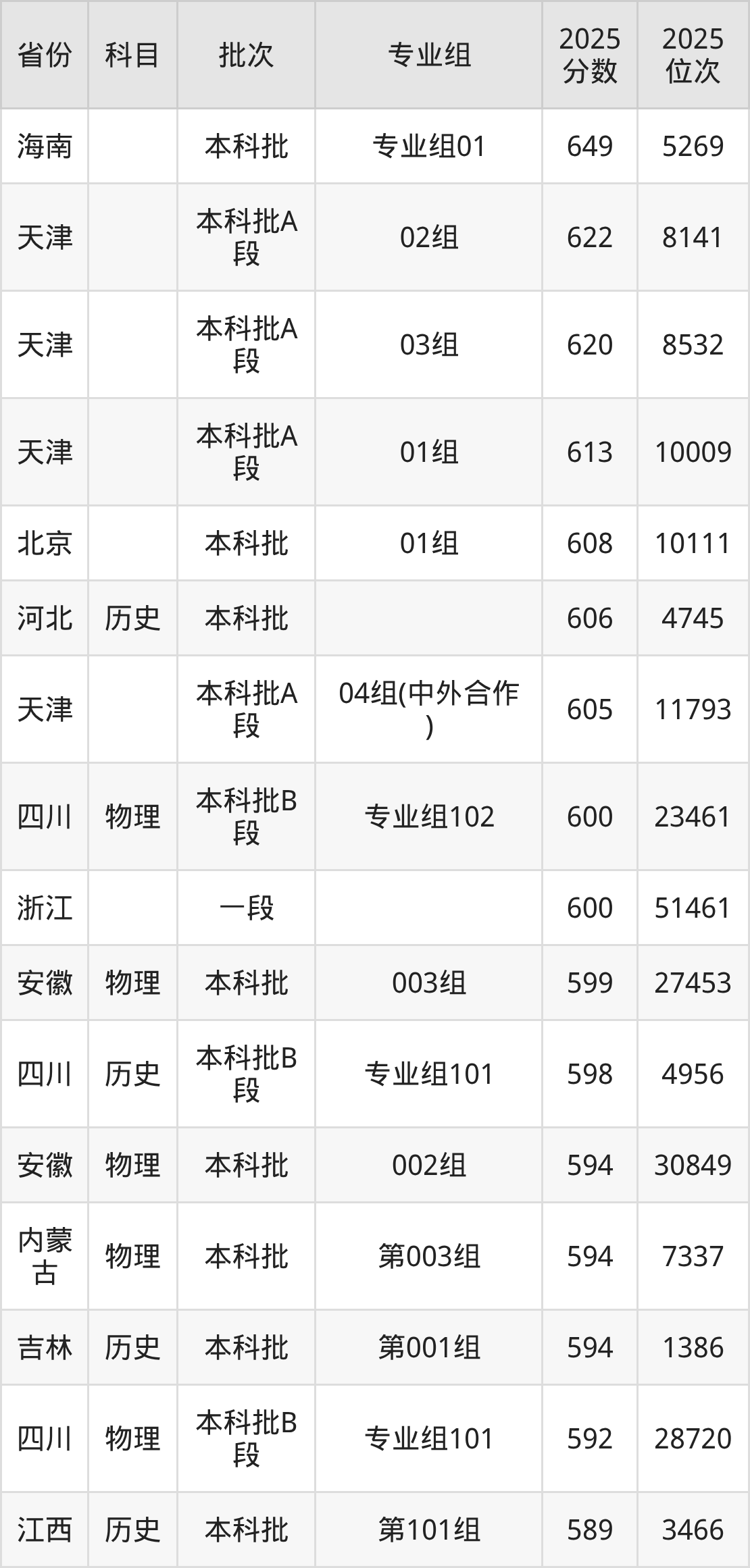 2025年首都经济贸易大学全国录取分数线504分到649分,录取最高在海南(专业组01)、录取最低在新疆(文科)。