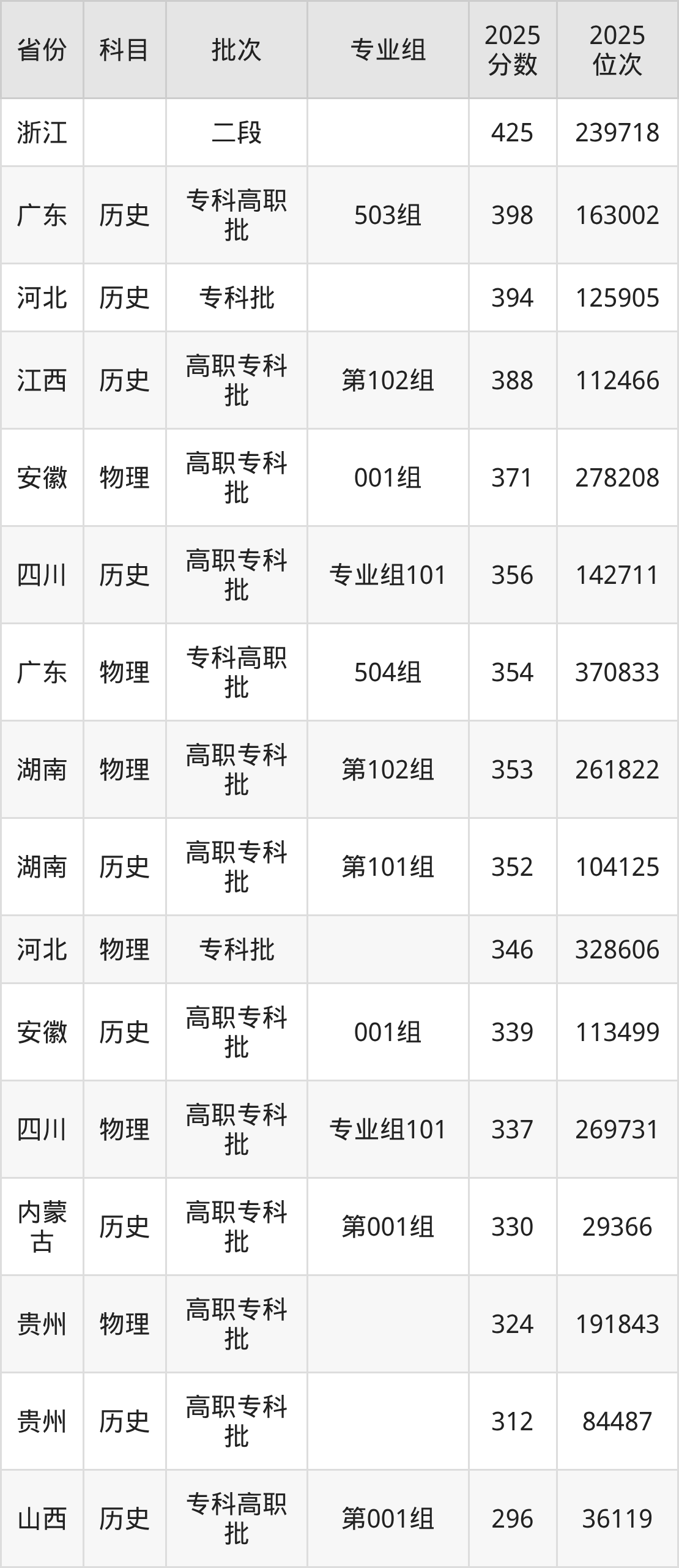 2025年江西青年职业学院全国录取分数线281分到425分,录取最高在浙江、录取最低在江西(第502组)。