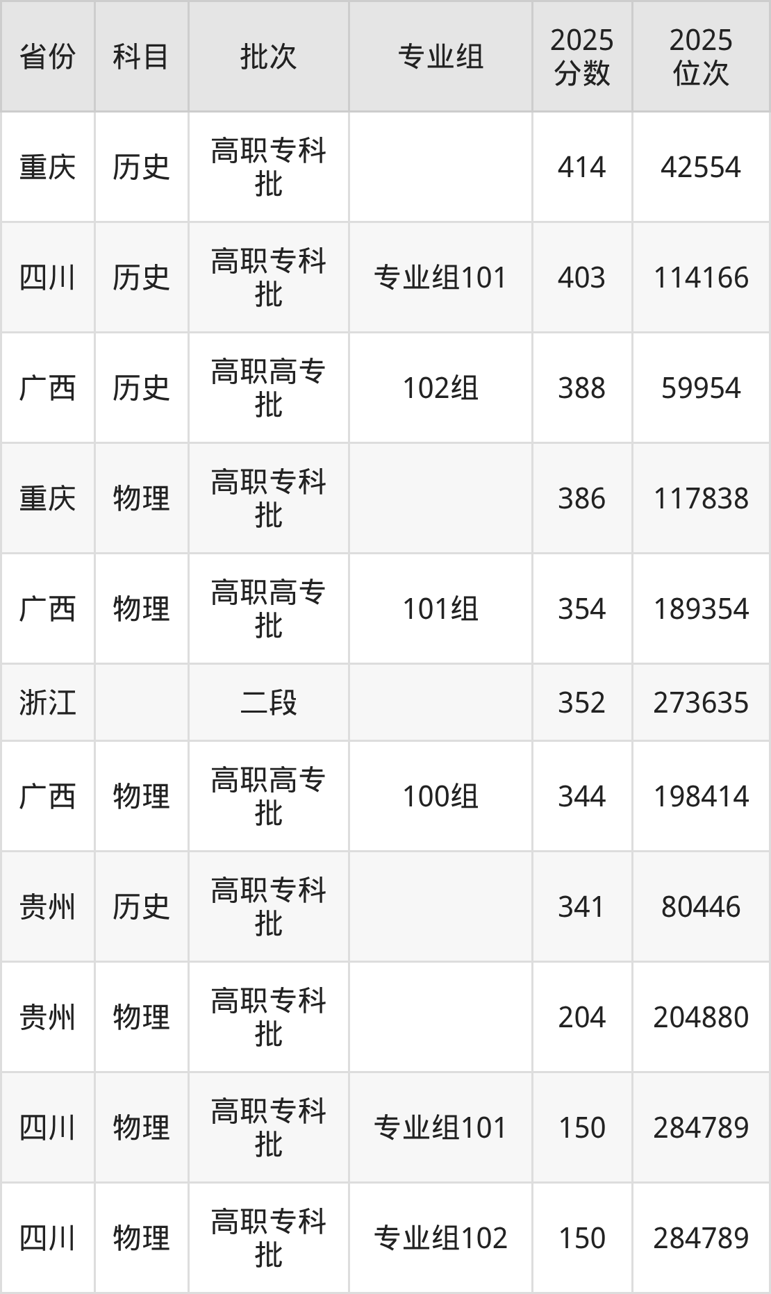 2025年安顺职业技术学院全国录取分数线150分到414分,录取最高在重庆(历史)、录取最低在四川(专业组102)。